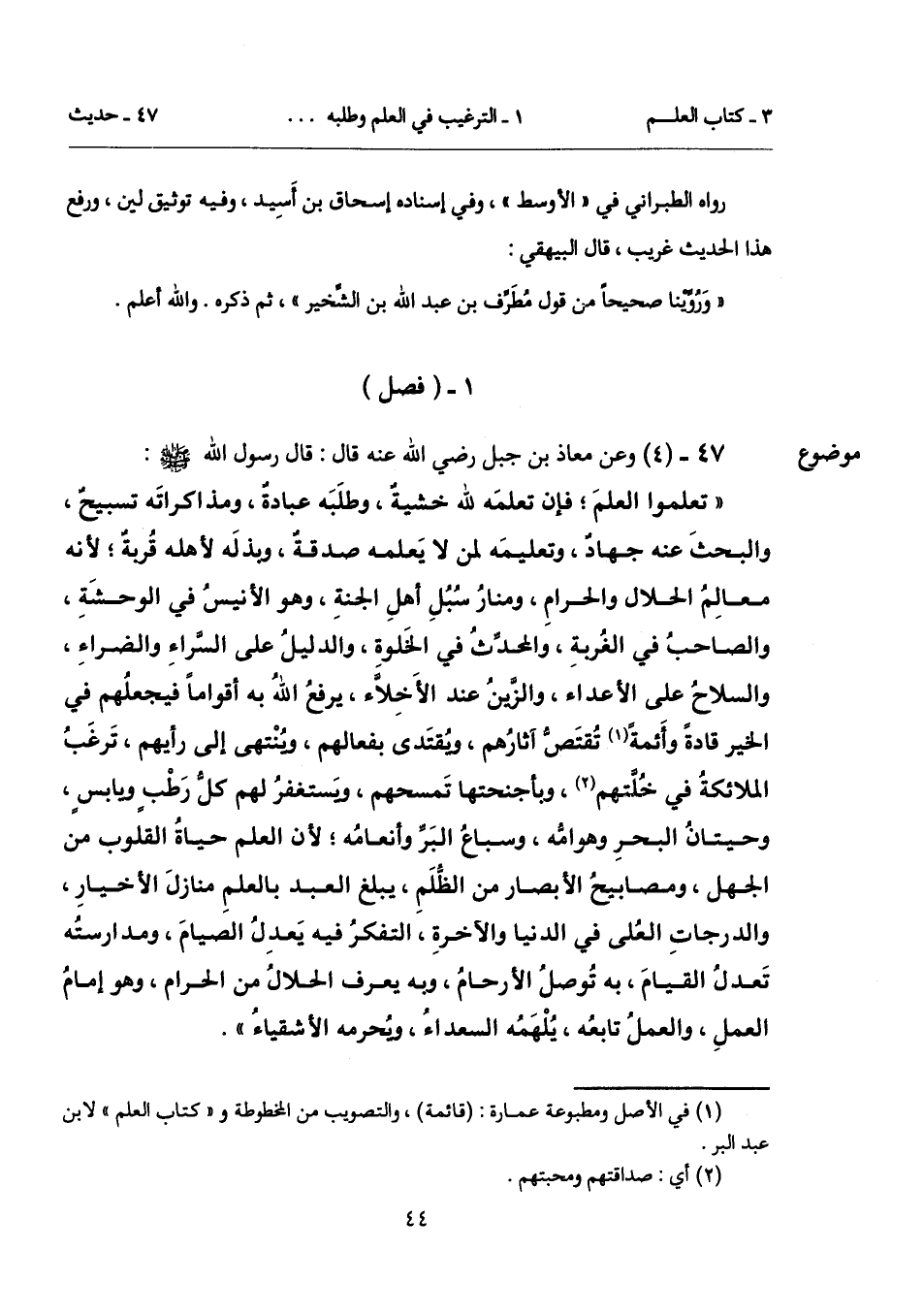 "تعلموا العلمَ؛ فإن تعلمَه لله خشيةٌ، وطلَبَه عبادةٌ، [ومذاكرته] (*) تسبيحٌ، والبحثَ عنه جهادٌ، وتعليمَه لمن لا يَعلمه صدقةٌ، وبذلَه لأهله قُربةٌ؛ لأنه معالِمُ الحلال والحرامِ، ومنارُ سُبُلِ أهلِ الجنةِ، وهو الأنيسُ في الوحشَةِ، والصاحبُ في الغُربةِ، والمحدِّثُ في الخَلوةِ، والدليلُ على السَّراءِ والضراءِ، والسلاحُ على الأعداء، والزَّينُ عند الأَخِلاَّء، يرفعُ اللهُ به أقواماً فيجعلُهم في الخير قادةً وأَئمةً (¬1) تُقتَصُّ آَثارُهم، ويُقتَدى بفعالهم، ويُنْتهى إلى رأيهم، تَرغَبُ الملائكةُ في خُلَّتهم (¬2)، وبأجنحتها تَمسحهم، ويَستغفرُ لهم كلُّ رَطْبٍ ويابسٍ، وحيتانُ البحرِ وهوامُّه، وسباعُ البَرِّ وأنعامُه؛ لأن العلم حياةُ القلوب من الجهل، ومصابيحُ الأبصار من الظُّلَمِ، يبلغ العبد بالعلمِ منازلَ الأخيارِ، والدرجاتِ العُلى في الدنيا والآخرةِ، التفكرُ فيه يَعدِلُ الصيامَ، ومدارستُه تَعدلُ القيامَ، به تُوصلُ الأرحامُ، وبه يعرف الحلالُ من الحرام، وهو إمامُ العملِ، والعملُ تابعُه، يُلْهَمُه السعداءُ، ويُحرمه الأشقياءُ".