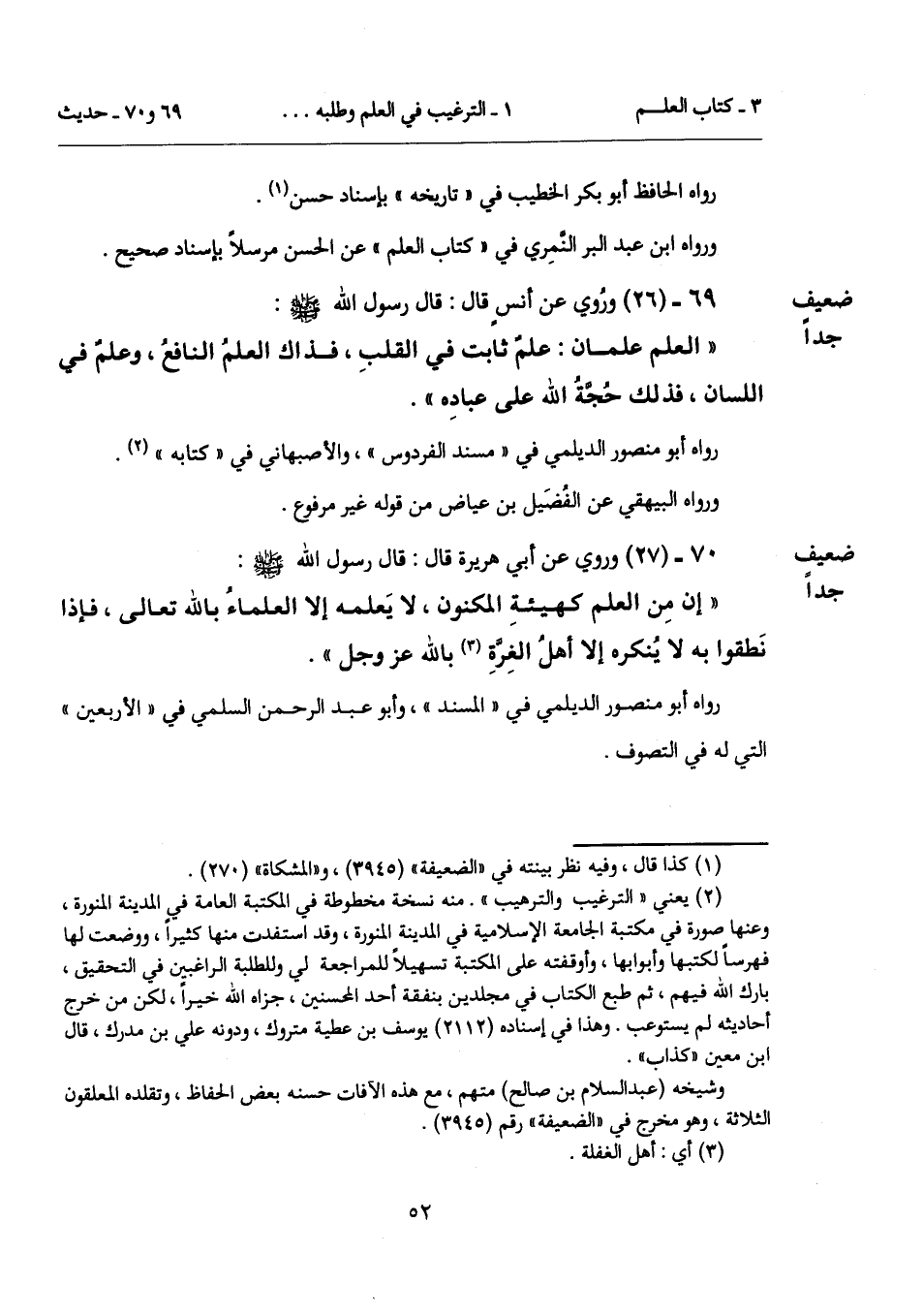 (¬2) يعني "الترغيب والترهيب". منه نسخة مخطوطة في المكتبة العامة في المدينة المنورة، وعنها صورة في مكتبة الجامعة الإسلامية في المدينة المنورة، وقد استفدت منها كثيراً، ووضعت لها فهرساً لكتبها وأبوابها، وأوقفته على المكتبة تسهيلاً للمراجعة لي وللطلبة الراغبين في التحقيق، بارك الله فيهم، ثم طبع الكتاب في مجلدين بنفقة أحد المحسنين، جزاه الله خيراً، لكن من خرج أحاديثه لم يستوعب. وهذا في إسناده (2112) يوسف بن عطية متروك، ودونه علي بن مدرك، قال ابن معين "كذاب".