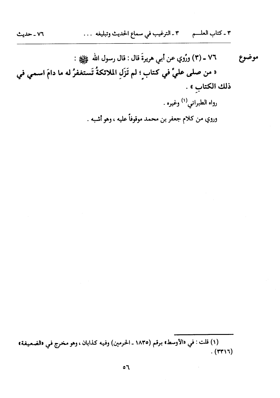 "من صلى عليَّ في كتابٍ؛ لم تَزَلِ الملائكةُ تَستغفرُ له ما دامَ اسمي في ذلك الكتابِ".
