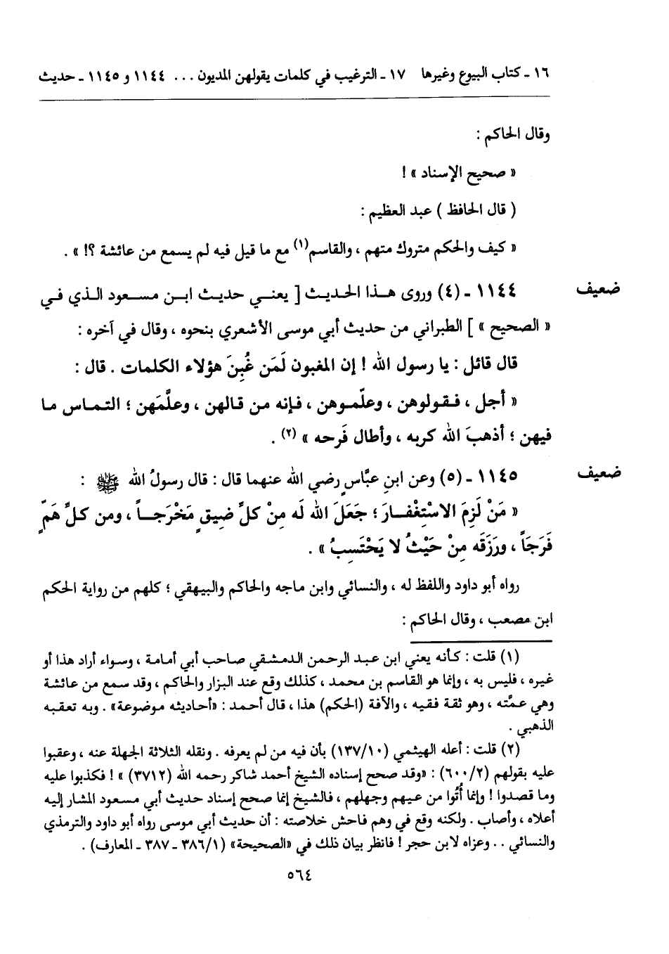 (¬1) قلت: كأنه يعني ابن عبد الرحمن الدمشقي صاحب أبي أمامة، وسواء أراد هذا أو غيره، فليس به، وإنما هو القاسم بن محمد، كذلك وقع عند البزار والحاكم، وقد سمع من عائشة وهي عمَّته، وهو ثقة فقيه، والآفة (الحكم) هذا، قال أحمد: "أحاديثه موضوعة". وبه تعقبه الذهبي.