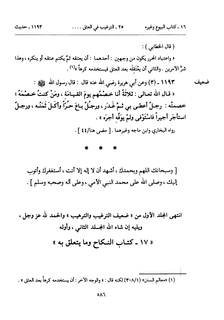 انتهى المجلد الأول من "ضعيف الترغيب والترهيب" والحمد لله عز وجل، ويليه إن شاء الله المجلد الثاني، وأوله