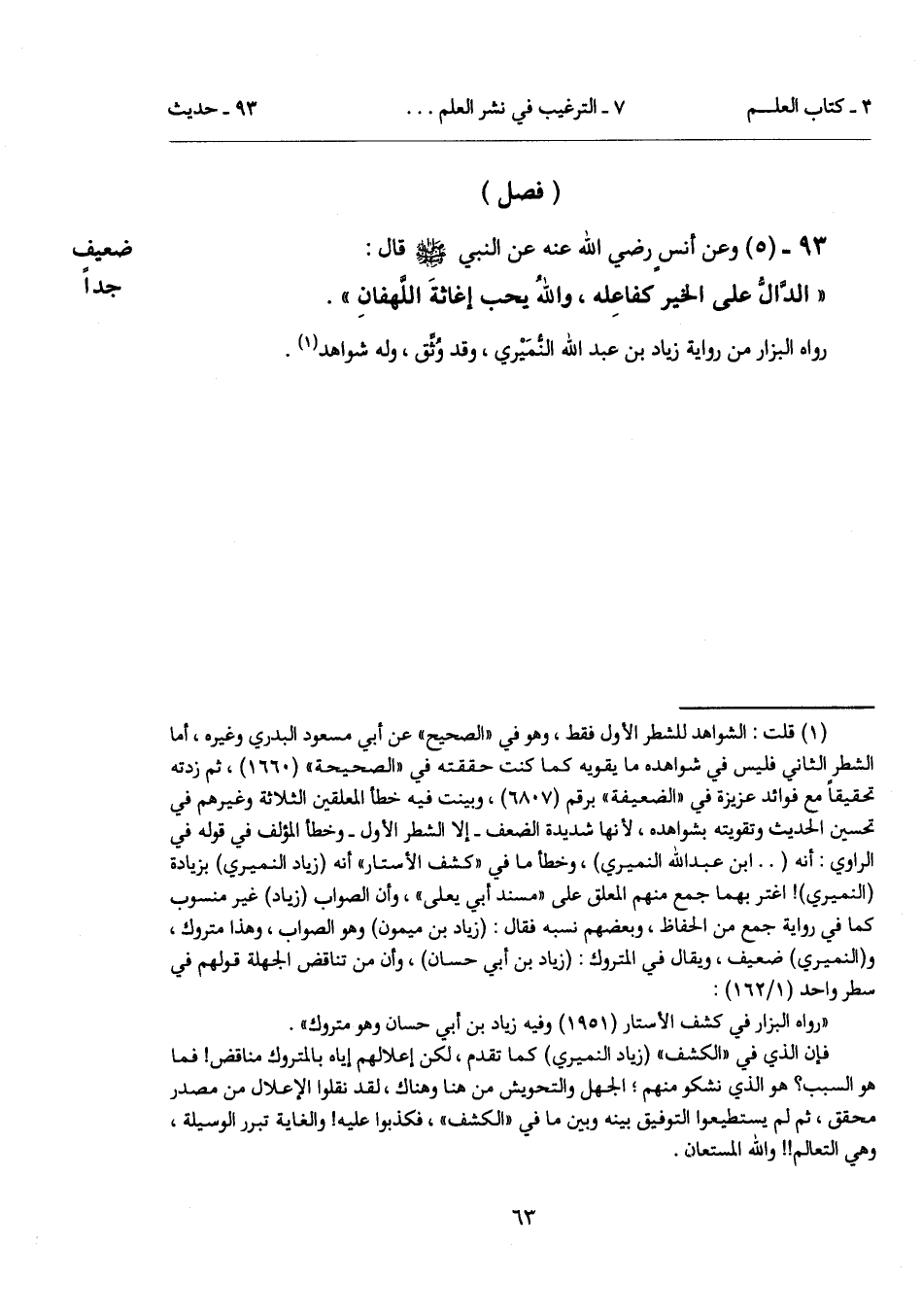(¬1) قلت: الشواهد للشطر الأول فقط، وهو في "الصحيح" عن أبي مسعود البدري وغيره، أما الشطر الثاني فليس في شواهده ما يقويه كما كنت حققته في "الصحيحة" (1660)، ثم زدته تحقيقاً مع فوائد عزيزة في "الضعيفة" برقم (6807)، وبينت فيه خطأ المعلقين الثلاثة وغيرهم في تحسين الحديث وتقويته بشواهده، لأنها شديدة الضعف -إلا الشطر الأول- وخطأ المؤلف في قوله في الراوي: أنه (.. ابن عبد الله النميري)، وخطأ ما في "كشف الأستار" أنه (زياد النميري) بزيادة (النميري)! اغتر بهما جمع منهم المعلق على "مسند أبي يعلى"، وهو الصواب (زياد) غير منسوب كما في رواية جمع من الحفاظ، وبعضهم نسبه فقال: (زياد بن ميمون) وهو الصواب، وهذا متروك، و (النميري) ضعيف، ويقال في المتروك: (زياد بن أبي حسان)، وأن من تناقض الجهلة قولهم في سطر واحد (1/ 162):