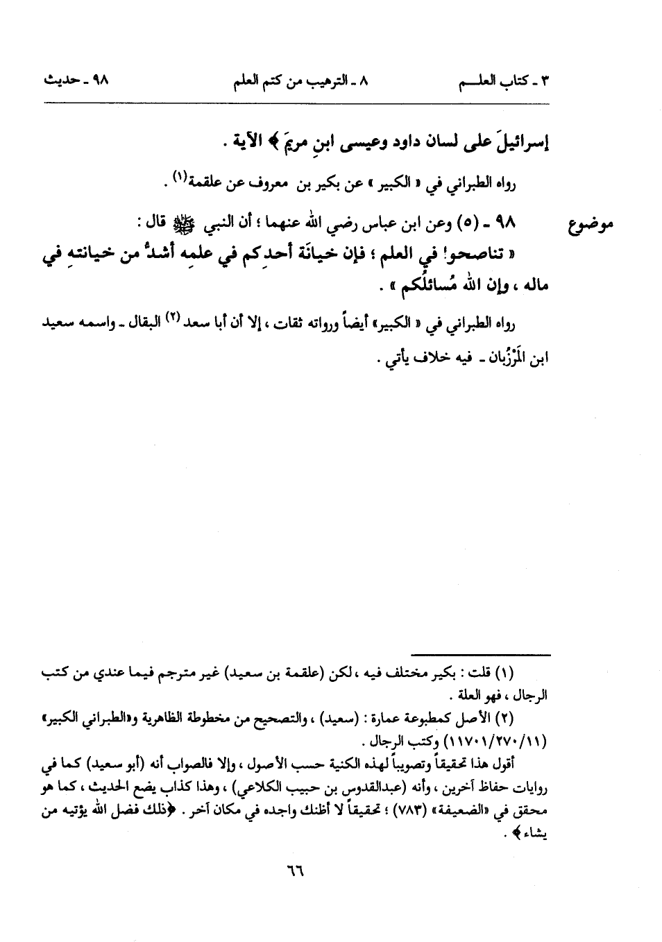 رواه الطبراني في "الكبير" عن بكير بن معروف عن علقمة (¬1).