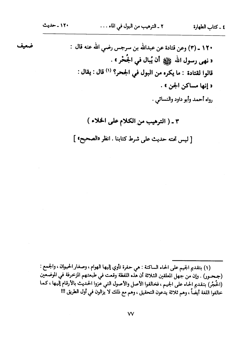(¬1) بتقديم الجيم على الحاء الساكنة: هي حفرة تأوي إليها الهوام، وصغار الحيوان، والجمع: (جحور). وإن من جهل المعلقين الثلاثة أن هذه اللفظة وقعت في طبعتهم المزخرفة في الموضعين (الحُجُر) بتقديم الحاء على الجيم، فخالفوا الأصل والأصول التي عزوا الحديث بالأرقام إليها، كما خالفوا اللغة أيضاً، وهم ثلاثة يدعون التحقيق، وهم مع ذلك لا يزالون في أول الطريق!!!