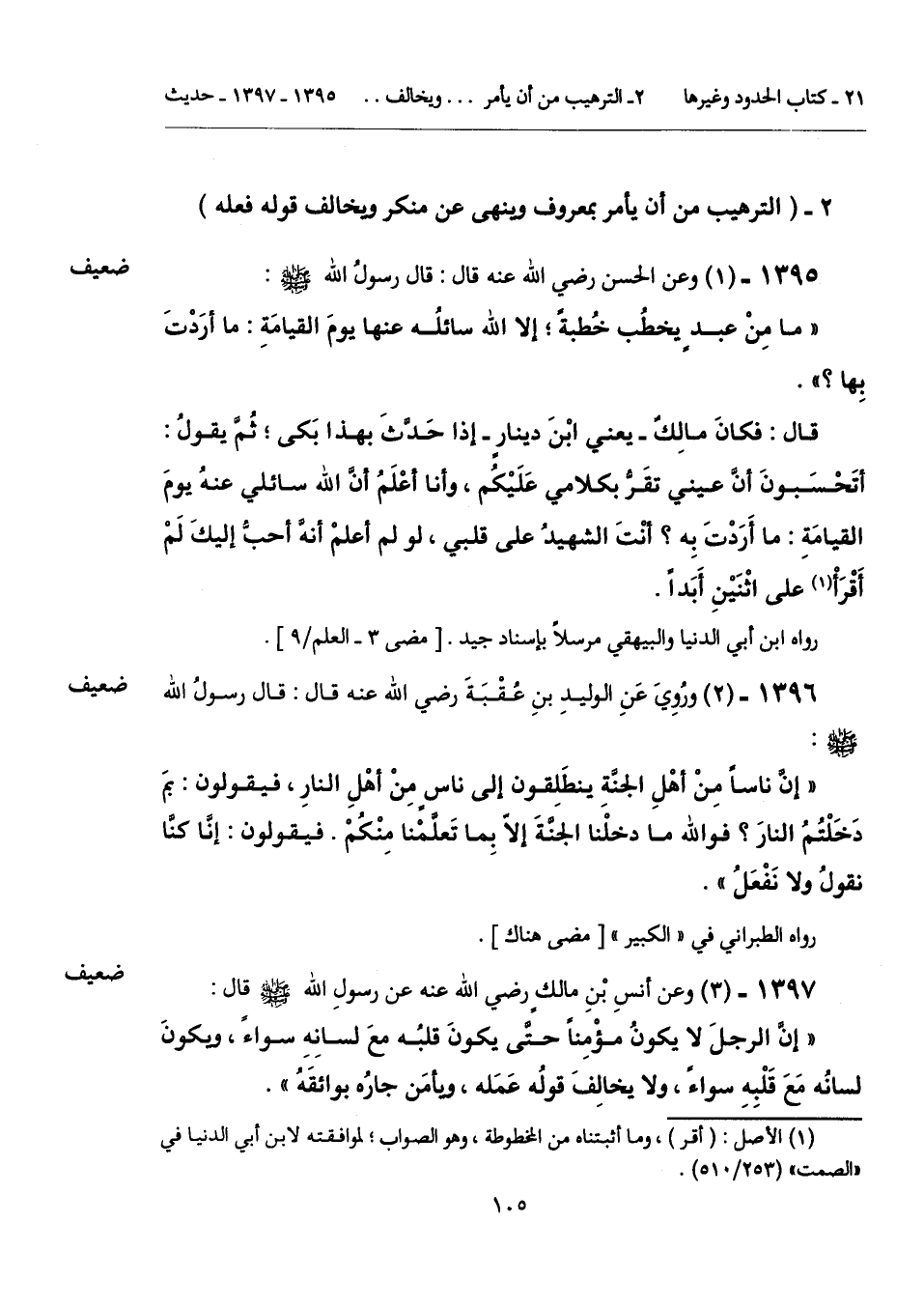 "إنَّ ناساً مِنْ أهْلِ الجَّنةِ ينطَلِقون إلى ناسٍ مِنْ أهْلِ النارِ، فيقولون: بمَ دَخَلْتُمُ النارَ؟ فوالله ما دخلْنا الجنَّةَ إلاّ بِما تَعلَّمْنا مِنْكُمْ. فيقولون: إنَّا كنَّا نقولُ ولا نَفْعَلُ".