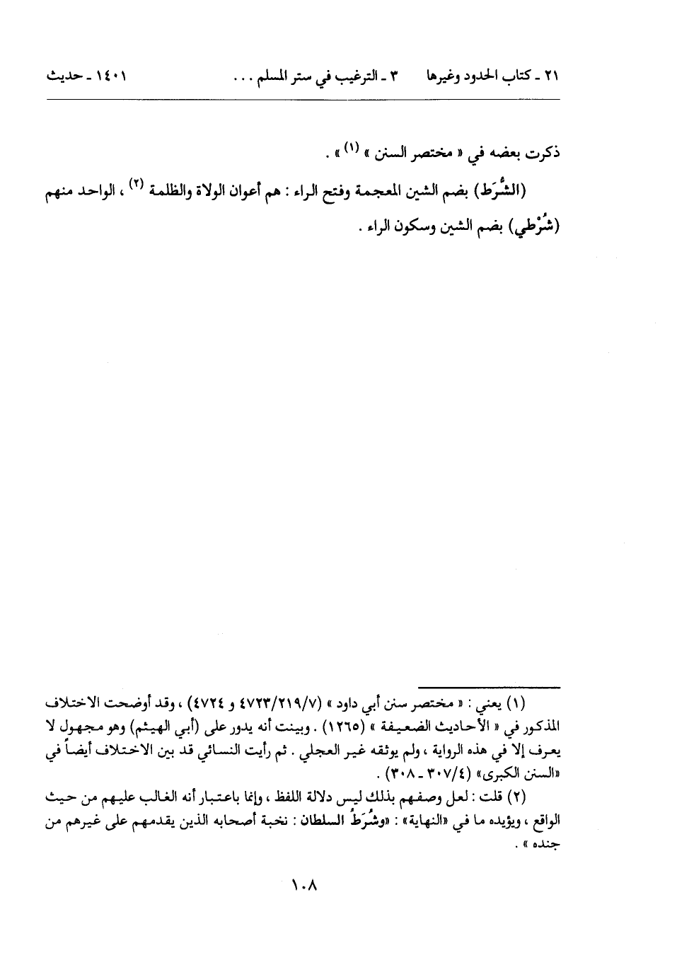 (¬2) قلت: لعل وصفهم بذلك ليس دلالة اللفظ، وإنما باعتبار أنه الغالب عليهم من حيث الواقع، ويؤيده ما في "النهاية": "وشُرَطُ السلطان: نخبة أصحابه الذين يقدمهم على غيرهم من جنده".