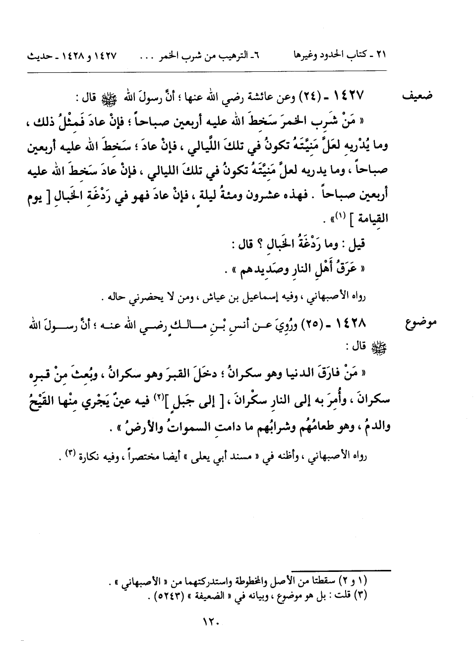 "مَنْ شَرِب الخمرَ سَخِطَ الله عليه أربعين صباحاً؛ فإنْ عادَ فَمِثْلُ ذلك، وما يُدْريهِ لعَلَّ مَنِيَّتَهُ تكونُ في تلكَ اللَّيالي، فإنْ عادَ؛ سَخِطَ الله عليه أربعين صباحاً، وما يدريه لعلَّ مَنِيَّتَهُ تكونُ في تلكَ الليالي، فإنْ عادَ سَخِطَ الله عليه أربعين صباحاً. فهذه عشرون ومئةُ ليلةٍ، فإنْ عادَ فهو في رَدْغَةِ الخَبالِ [يوم القِيامة] (1) ".