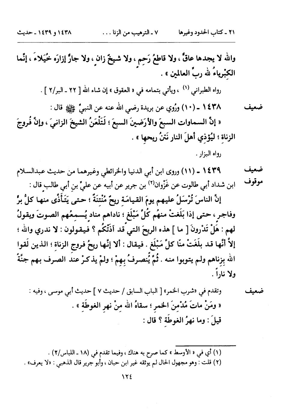 "إنَّ السماوات السبعَ والأرَضينَ السبعَ؛ لَتَلْعَنُ الشيخَ الزانيَ، وإنَّ فُروجَ الزناةِ؛ ليُؤذِي أهلَ النار نَتنُ ريحهِا".