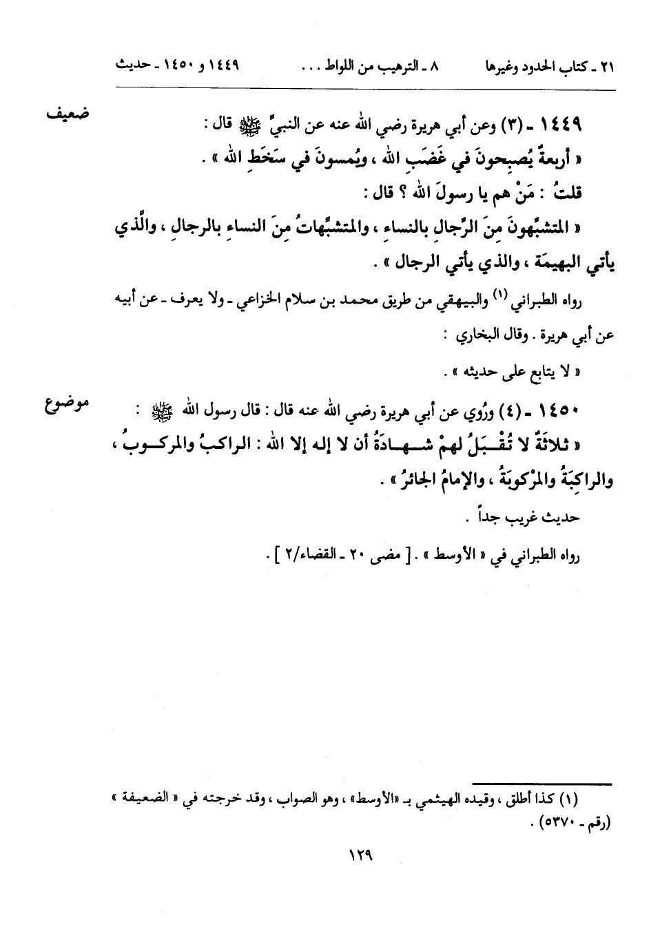 1449 - (3) [ضعيف] وعن أبي هريرة رضي الله عنه عن النبيَّ - صلى الله عليه وسلم - قال: