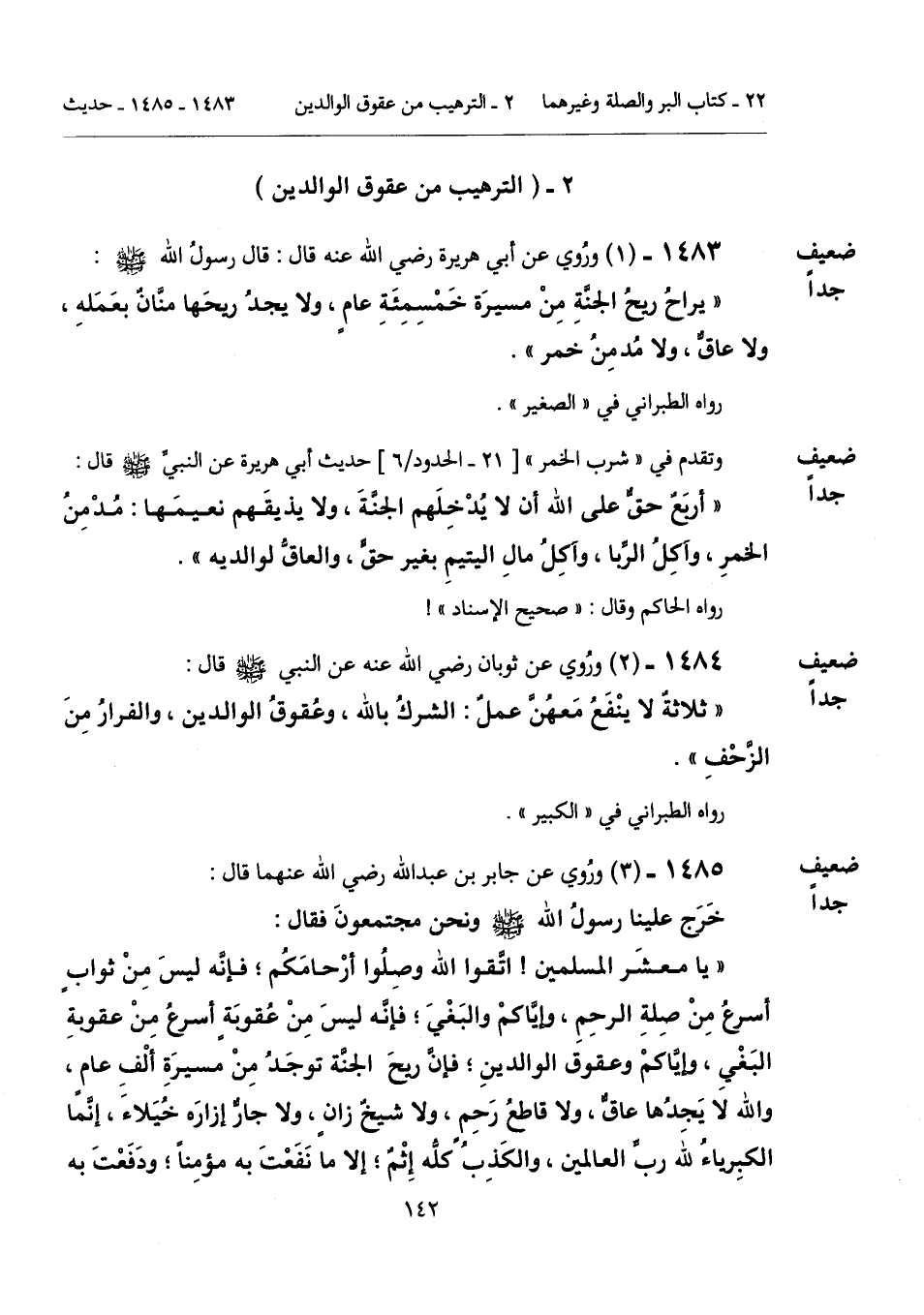 "يا معشَر المسلمين! اتَّقوا الله وصِلُوا أرْحامَكُم؛ فإنَّه ليسَ مِنْ ثوابٍ أسرعُ مِنْ صِلةِ الرحِمِ، وإيَّاكمْ والبَغْيَ؛ فإنَّه ليسَ مِنْ عُقوبَةٍ أسرعُ مِنْ عقوبةِ البَغْي، وإيَّاكمْ وعقوق الوالدينِ، فإنَّ ريحَ الجنَّة توجَدُ مِنْ مَسيرَةِ ألْفِ عامٍ، والله لا يَجدُها عاقٌّ، ولا قاطعُ رَحِمٍ، ولا شيخٌ زانٍ، ولا جارٌّ إزارَه خُيَلاءَ، إنَّما الكبِرياءُ لله ربَّ العالمين، والكَذِبُ كلُّه إِثْمٌ؛ إلا ما نَفَعْتَ به مؤمِناً؛ ودَفَعْتَ به