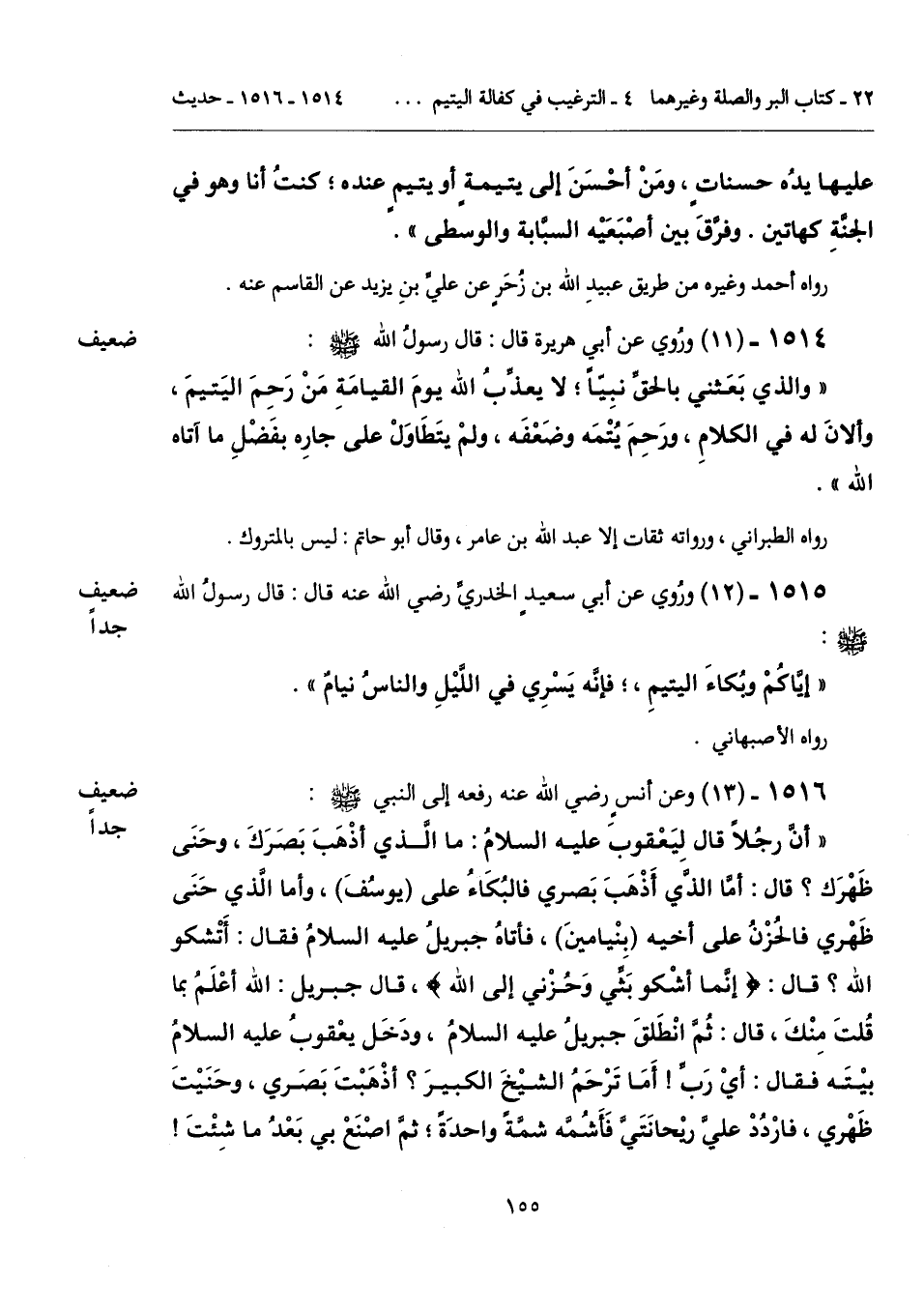 "والذي بَعَثني بالحقِّ نبِيّاً؛ لا يعذِّبُ الله يومَ القيامَةِ مَنْ رَحِمَ اليَتيمَ، وألانَ له في الكلامِ، ورَحِمَ يُتْمَه وضَعْفَه، ولمْ يتَطَاوَلْ على جارِه بفَضْلِ ما آتاه الله".