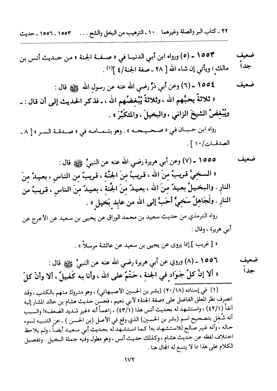 (¬1) في إسناده (18/ 20) (بشر بن الحسين الأصبهاني)، وهو متروك متهم بالكذب، وقد انصرف نظر المعلق الفاضل على "صفة الجنة" لأبي نعيم، فحسن حديث هشام بن خالد المشار إليه آنفاً (1/ 42)، واستشهد له بحديث أنس هذا (1/ 43)، زاعماً أنه "غير شديد الضعف"! والسبب أنه شُغِل بتصحيح اسم (بشر بن الحسين) الذي وقع في الأصل (بن الحسن) -عن التنبيه لسوء حاله، وأنه غير صالح للاستشهاد به! كما استشهد له بحديث أبي سعيد أيضاً، ولم يلاحظ اختلاف لفظه عن حديث هشام، وكذلك حديث أنس، وهو مطول وفيه جملة البخيل. وتفصيل الكلام على هذا مما لا يتسع له المجال هنا.