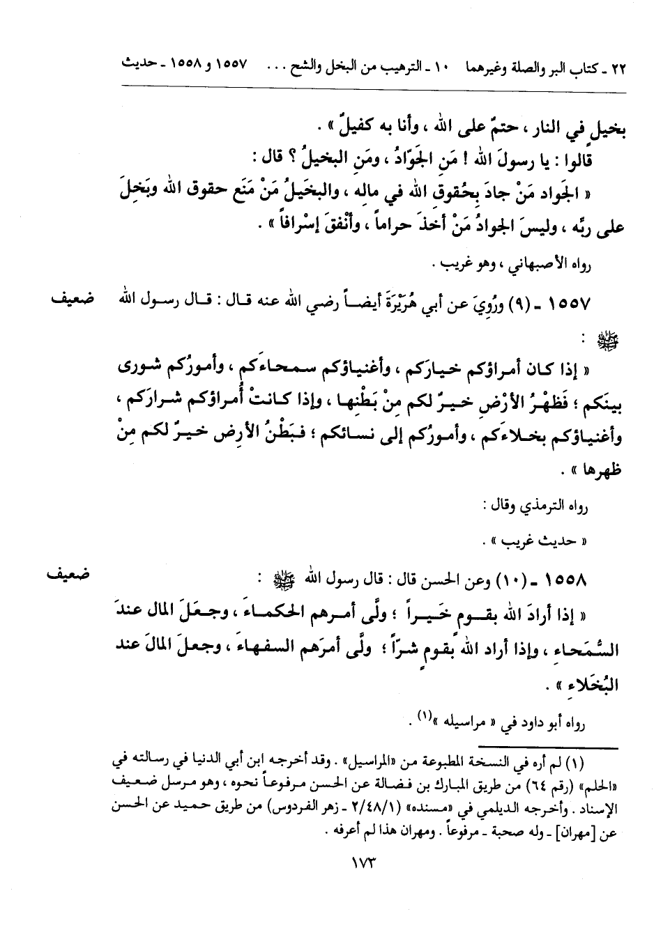 "إذا كان أمراؤكم خيارَكم، وأغنياؤكم سمحاءَكم، وأمورُكم شورى بينَكم؛ فَظهْرُ الأرْضِ خيرٌ لكم مِنْ بَطْنِها، وإذا كانتْ أُمراؤكم شرارَكم، وأغنياؤكم بخلاءَكم، وأمورُكم إلى نسائكم؛ فبَطْنُ الأرِض خيرٌ لكم مِنْ ظهرها".