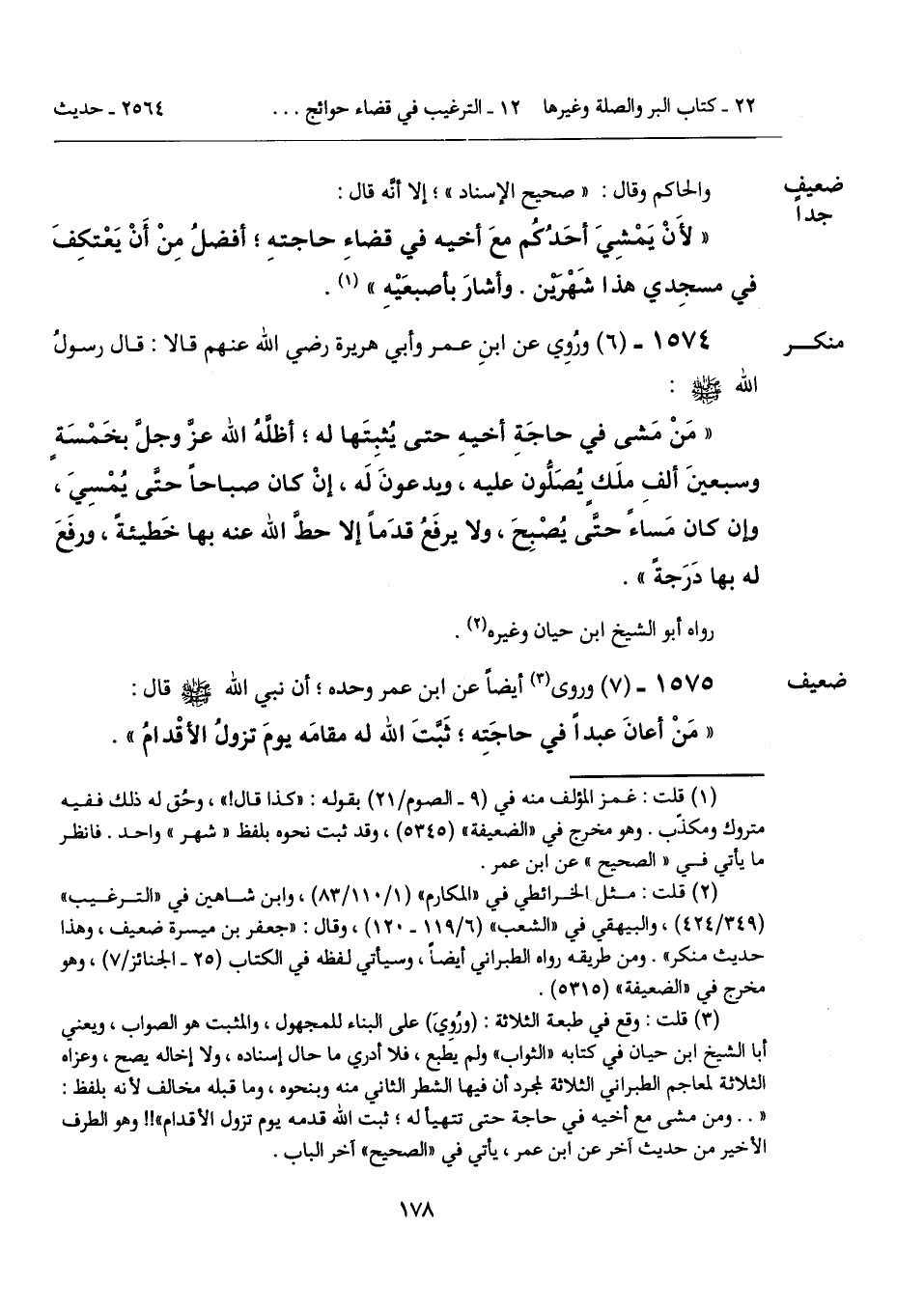 (¬3) قلت: وقع في طبعة الثلاثة: (ورُويَ) على البناء للمجهول، والمثبت هو الصواب، ويعني أبا الشيخ ابن حيان في كتابه "الثواب" ولم يطبع، فلا أدري ما حال إسناده، ولا إخاله يصح، وعزاه الثلاثة لمعاجم الطبراني الثلاثة لمجرد أن فيها الشطر الثاني منه وبنحوه، وما قبله مخالف لأنه بلفظ: ". . ومن مشى مع أخيه في حاجة حتى تتهيأ له؛ ثبت الله قدمه يوم تزول الأقدام"!! وهو الطرف الأخير من حديث آخر عن ابن عمر، يأتي في "الصحيح" آخر الباب.