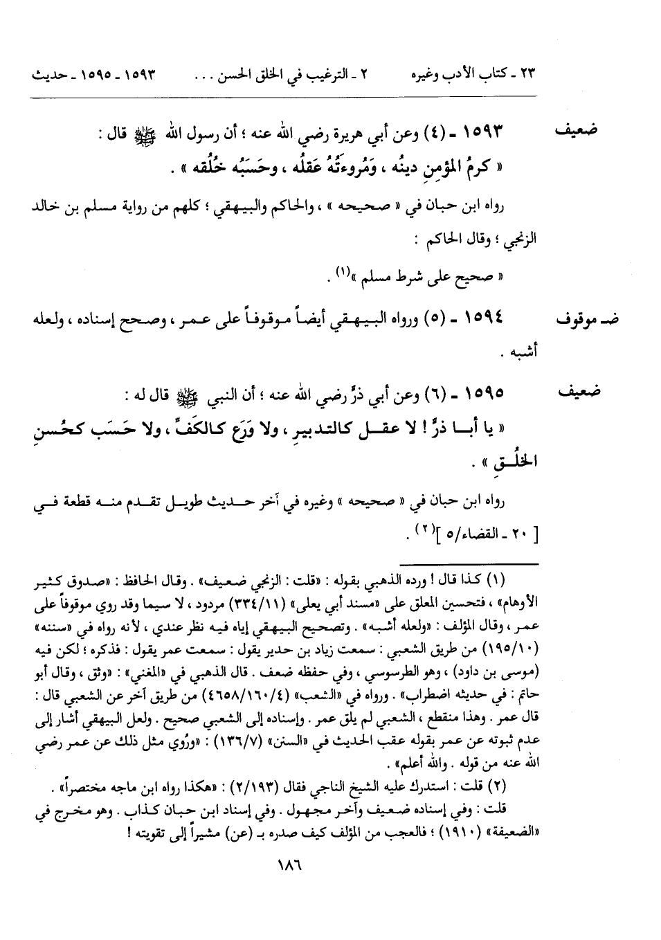 (¬1) كذا قال! ورده الذهبي بقوله: "قلت: الزنجي ضعيف". وقال الحافظ: "صدوق كثير الأوهام"، فتحسين المعلق على "مسند أبي يعلى" (11/ 334) مردود، لا سيما وقد روي موقوفاً على عمر، وقال المؤلف: "ولعله أشبه". وتصحيح البيهقي إياه فيه نظر عندي، لأنه رواه في "سننه" (10/ 195) من طريق الشعبي: سمعت زياد بن حدير يقول: سمعت عمر يقول: فذكره؛ لكن فيه (موسى بن داود)، وهو الطرسوسي، وفي حفظه ضعف. قال الذهبي في "المغني": "وثق، وقال أبو حاتم: في حديثه اضطراب". ورواه في "الشعب" (4/ 160/ 4658) من طريق آخر عن الشعبي قال: قال عمر. وهذا منقطع، الشعبي لم يلق عمر. وإسناده إلى الشعبي صحيح. ولعل البيهقي أشار إلى عدم ثبوته عن عمر بقوله عقب الحديث في "السنن" (7/ 136): "ورُوي مثل ذلك عن عمر رضي الله عنه من قوله. والله أعلم".