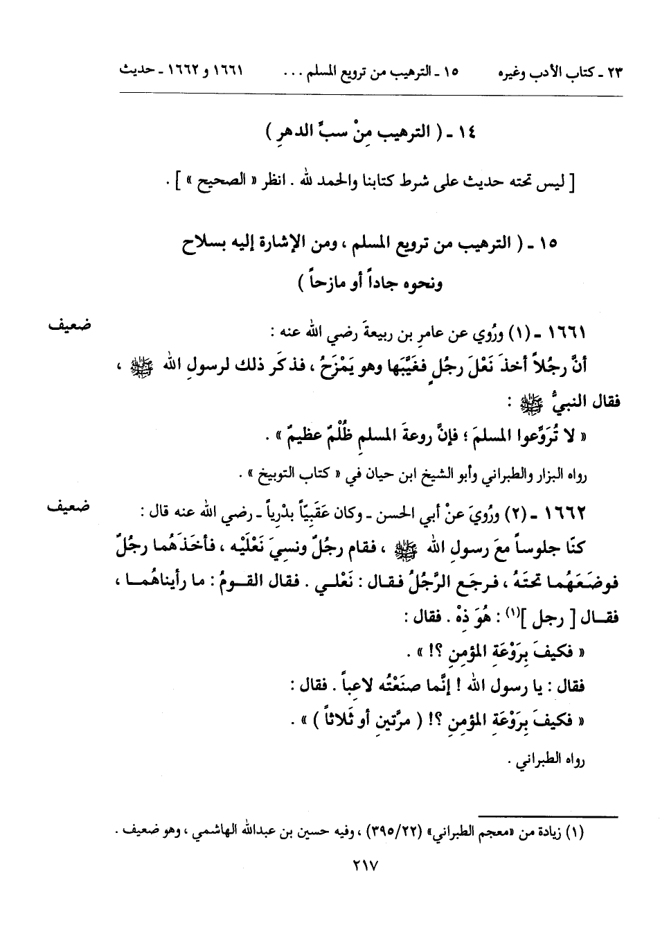 15 - (الترهيب من ترويع المسلم، ومن الإشارة إليه بسلاح ونحوه جاداً أو مازحاً).