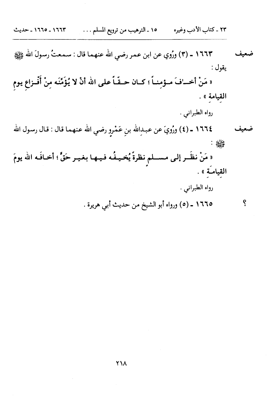 "مَنْ نظَر إلى مسلمٍ نظرةً يُخيفُه فيها بغير حَقٍّ؛ أخافَه الله يومَ القِيامَةِ".