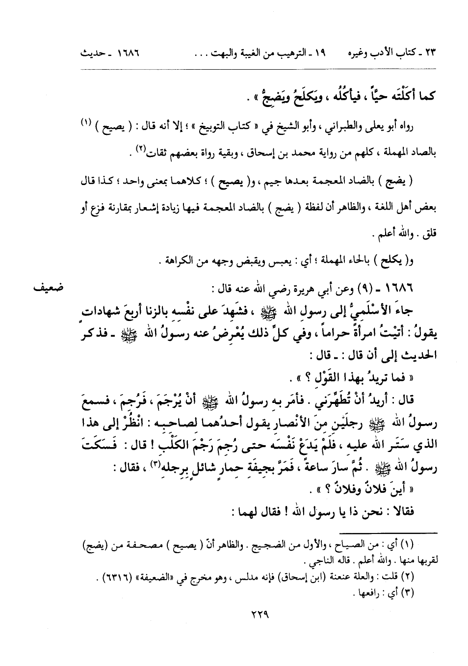 قال: أريدُ أنْ تُطَهِّرَني. فأمَر بهِ رسولُ الله - صلى الله عليه وسلم - أنْ يُرْجَمَ، فَرُجِمَ، فسمعَ رسولُ الله - صلى الله عليه وسلم - رجلَيْنِ مِنَ الأنْصارِ يقول أحدُهما لِصاحِبِه: انْظُرْ إلى هذا الذي سَتَر الله عليهِ، فلَمْ يَدع نَفْسَه حتى رُجِمَ رَجْمَ الكَلْب! قال: فَسَكَتَ رسولُ الله - صلى الله عليه وسلم -. ثم سارَ ساعةً، فَمَرَّ بجِيفَةِ حِمارٍ شائلٍ بِرِجلهِ (¬3)، فقال: