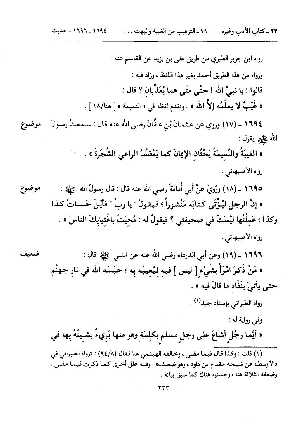 "مَنْ ذَكرَ امْرَأً بشَيْءٍ [ليس] فيهِ لِيُعِيبَه بِه؛ حبَسَه الله في نارِ جهنَّم حتى يأتيَ بنَفادِ ما قالَ فيه".