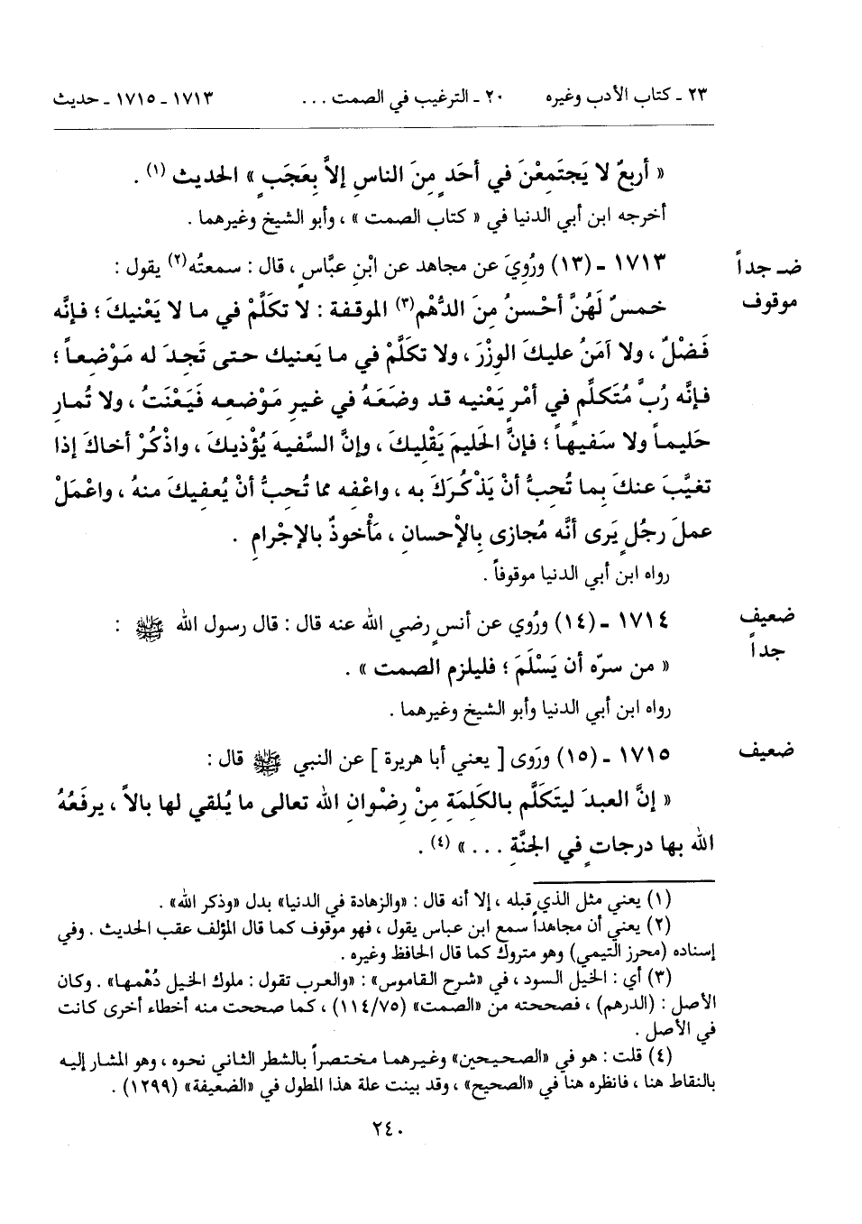 "أربعٌ لا يَجتَمِعْنَ في أحَدٍ مِنَ الناسِ إلّا بِعَجَبٍ" الحديث (¬1).