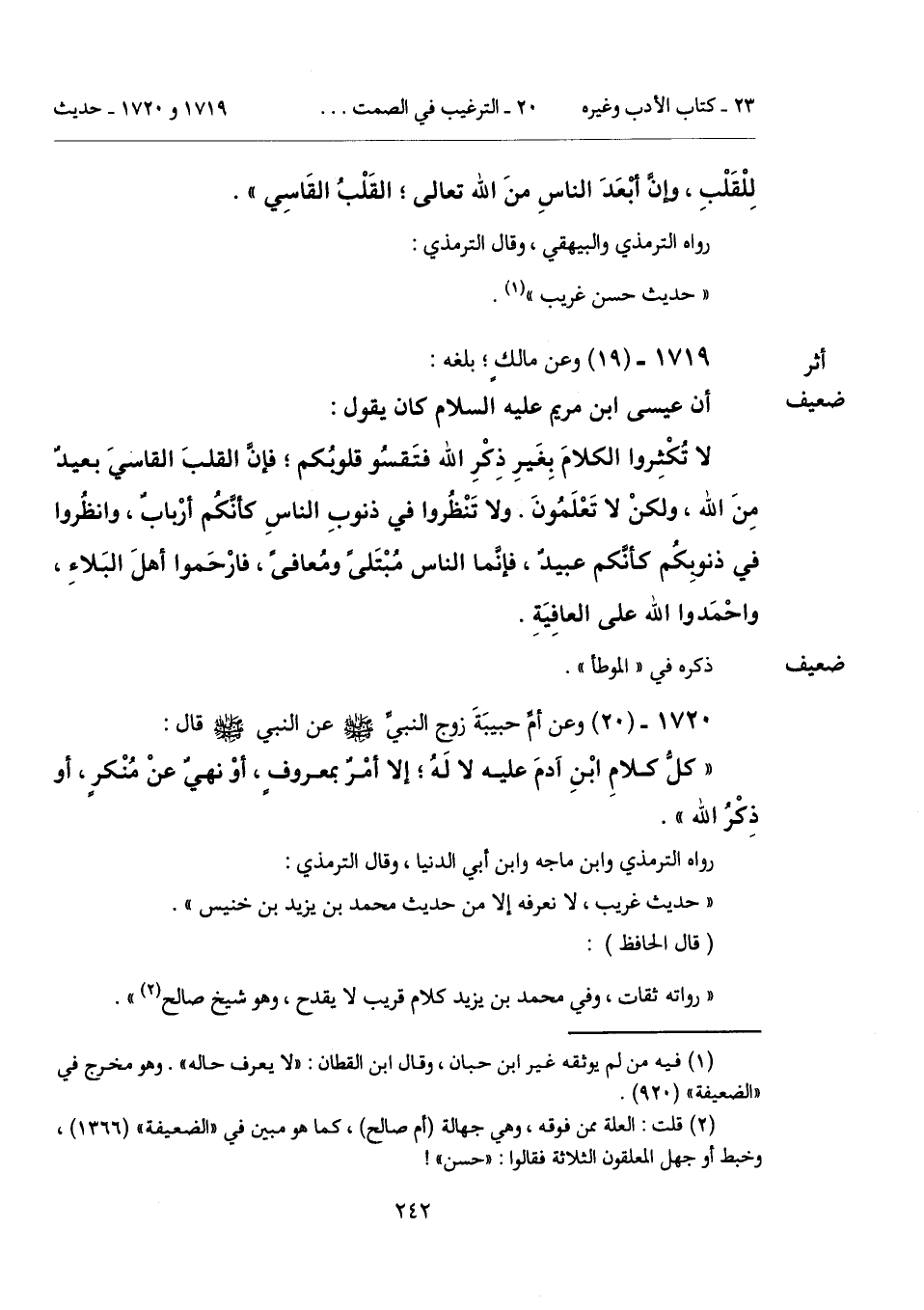 لا تُكْثِروا الكلامَ بِغَيرِ ذِكْرِ الله فتَقسُو قلوبُكم؛ فإنَّ القلبَ القاسيَ بعيدٌ مِنَ الله، ولكنْ لا تَعْلَمُونَ. ولا تَنْظُروا في ذنوبِ الناسِ كأنَّكُم أرْبابٌ، وانظُروا في ذنوِبكُم كأنَّكم عبيدٌ، فإنَّما الناس مُبْتَلىً ومُعافىً، فارْحَموا أهلَ البَلاءِ، واحْمَدوا الله على العافِيَةِ.