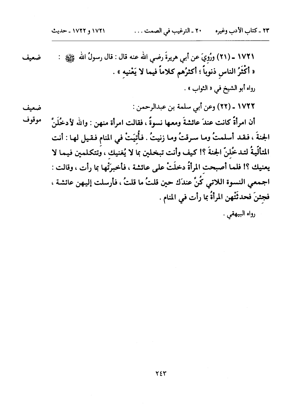 1721 - (21) [ضعيف] ورُوِيَ عن أبي هريرةَ رضي الله عنه قال: قال رسولُ الله - صلى الله عليه وسلم -: