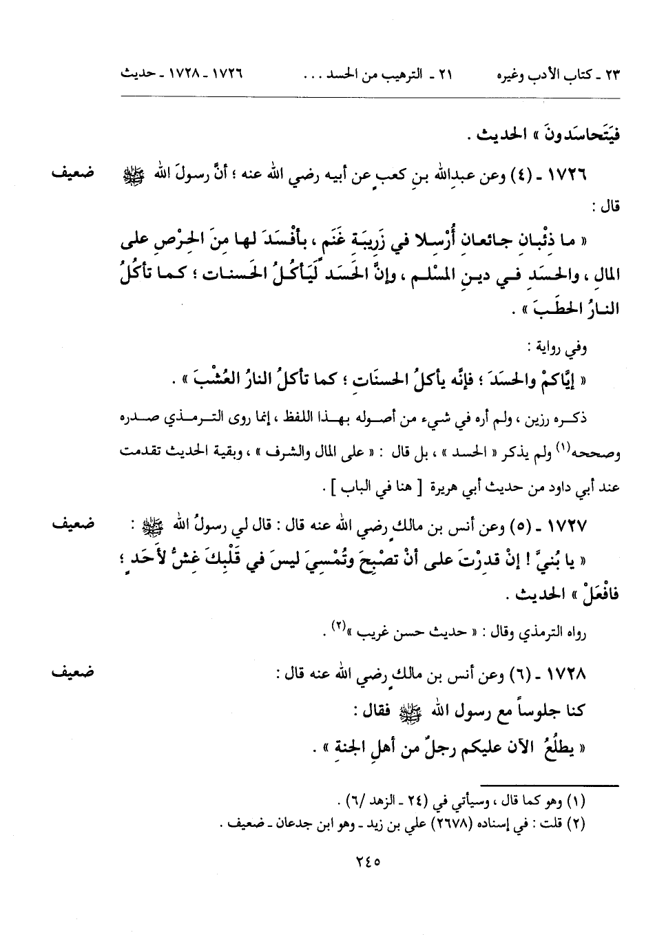 "ما ذِئْبانِ جائعانِ أُرْسِلا في زَرِيبَةِ غَنَمٍ، بأفْسَدَ لها مِنَ الحِرْصِ على المالِ، والحسَدِ في دينِ المسْلم، وإنَّ الحَسَد لَيأكُلُ الحَسنات؛ كما تأكُلُ النارُ الحطَبَ".