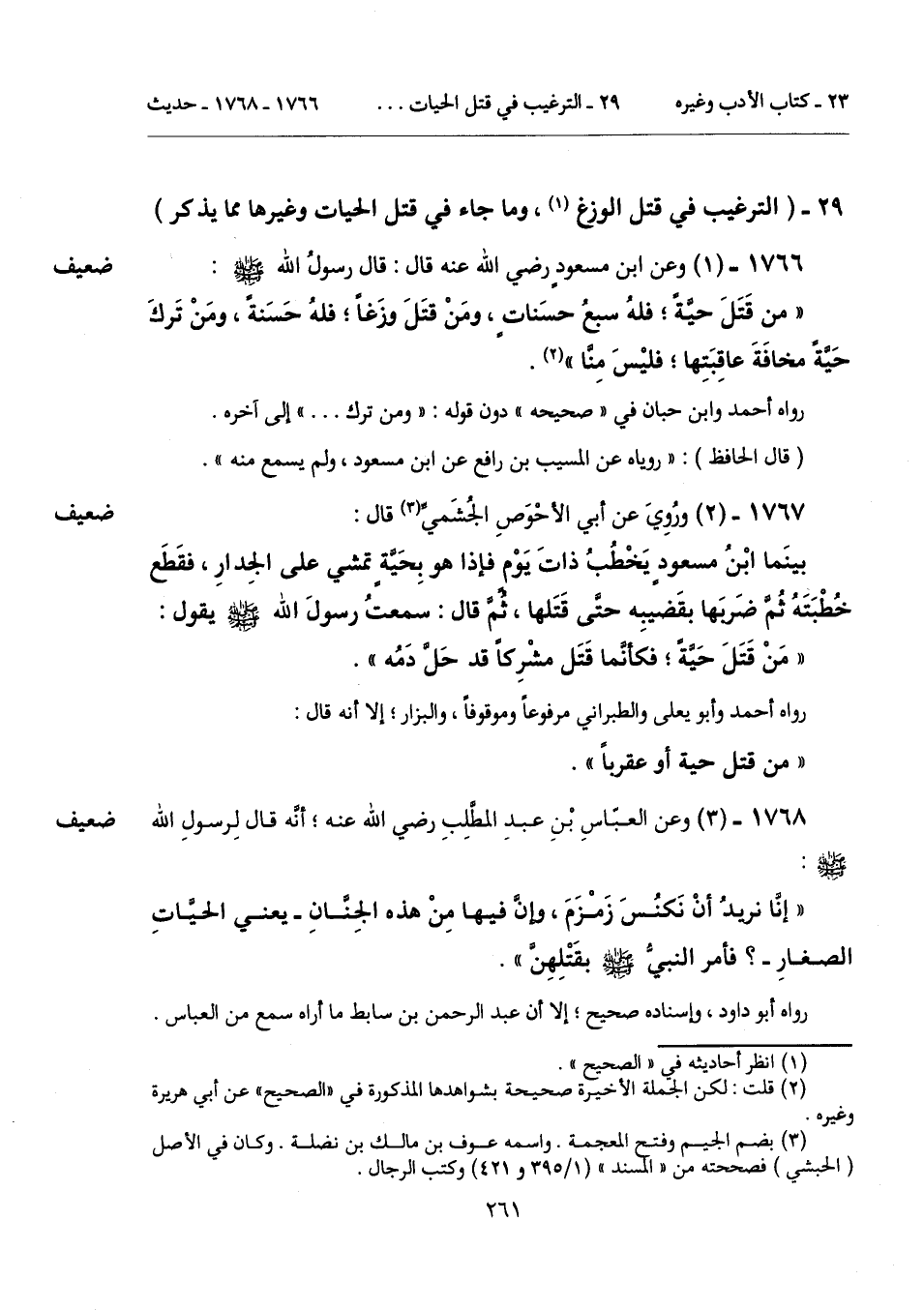 "من قَتَلَ حيَّةً؛ فلهُ سبعُ حسَناتٍ، ومَنْ قتَلَ وزَغاً؛ فلهُ حَسَنةً، ومَنْ تَركَ حَيَّةً مخافَةَ عاقِبَتِها؛ فليْسَ مِنَّا" (¬2).