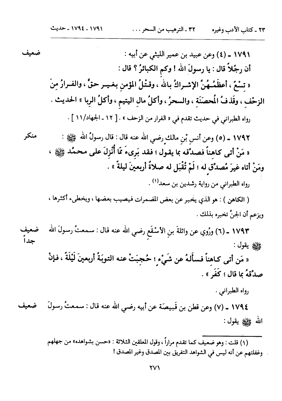 "مَنْ أتى كاهِناً فصدَّقه بما يقول؛ فقد بَرِىءَ ممّا أُنْزِلَ على محمَّد - صلى الله عليه وسلم -، ومَنْ أتاه غيرَ مُصدِّقٍ له؛ لَمْ تُقْبَل له صلاةٌ أربعينَ ليلةً".