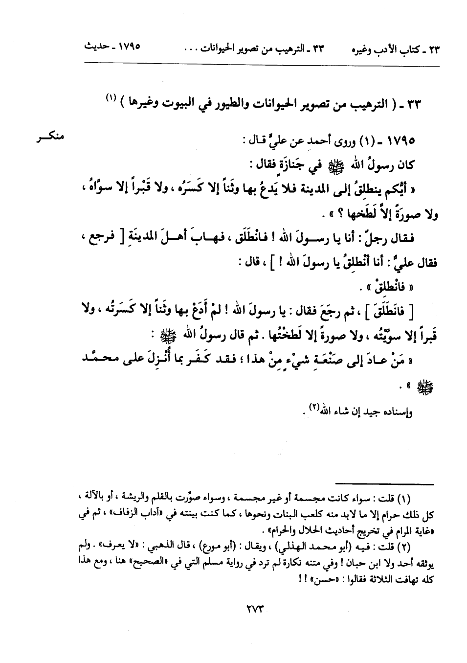 (¬1) قلت: سواء كانت مجسمة أو غير مجسمة، وسواء صوِّرت بالقلم والريشة، أو بالآلة، كل ذلك حرام إلا ما لا بد منه كلعب البنات ونحوها، كما كنت بينته في "أداب الزفاف"، ثم في "غاية المرام في تخريج أحاديث الحلال والحرام".