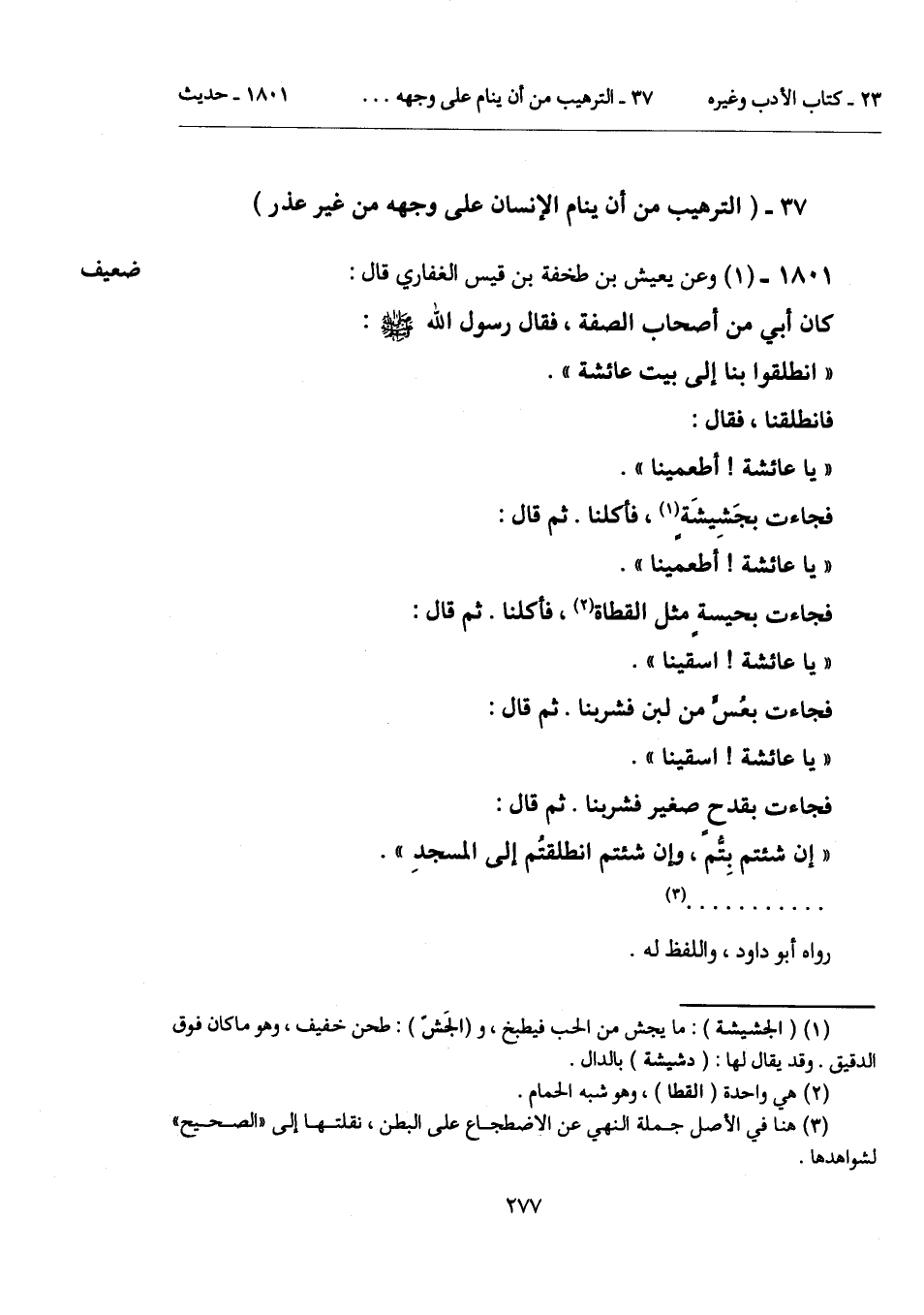 (¬3) هنا في الأصل جملة النهي عن الاضطجاع على البطن، نقلتها إلى "الصحيح" لشواهدها.