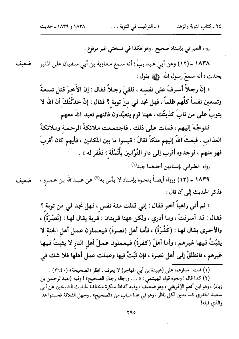 1838 - (12) [ضعيف] وعن أبي عبد ربّ؛ أنه سمع معاوية بن أبي سفيان على المنبر يحدث؛ أنه سمعَ رسولَ الله - صلى الله عليه وسلم - يقول: