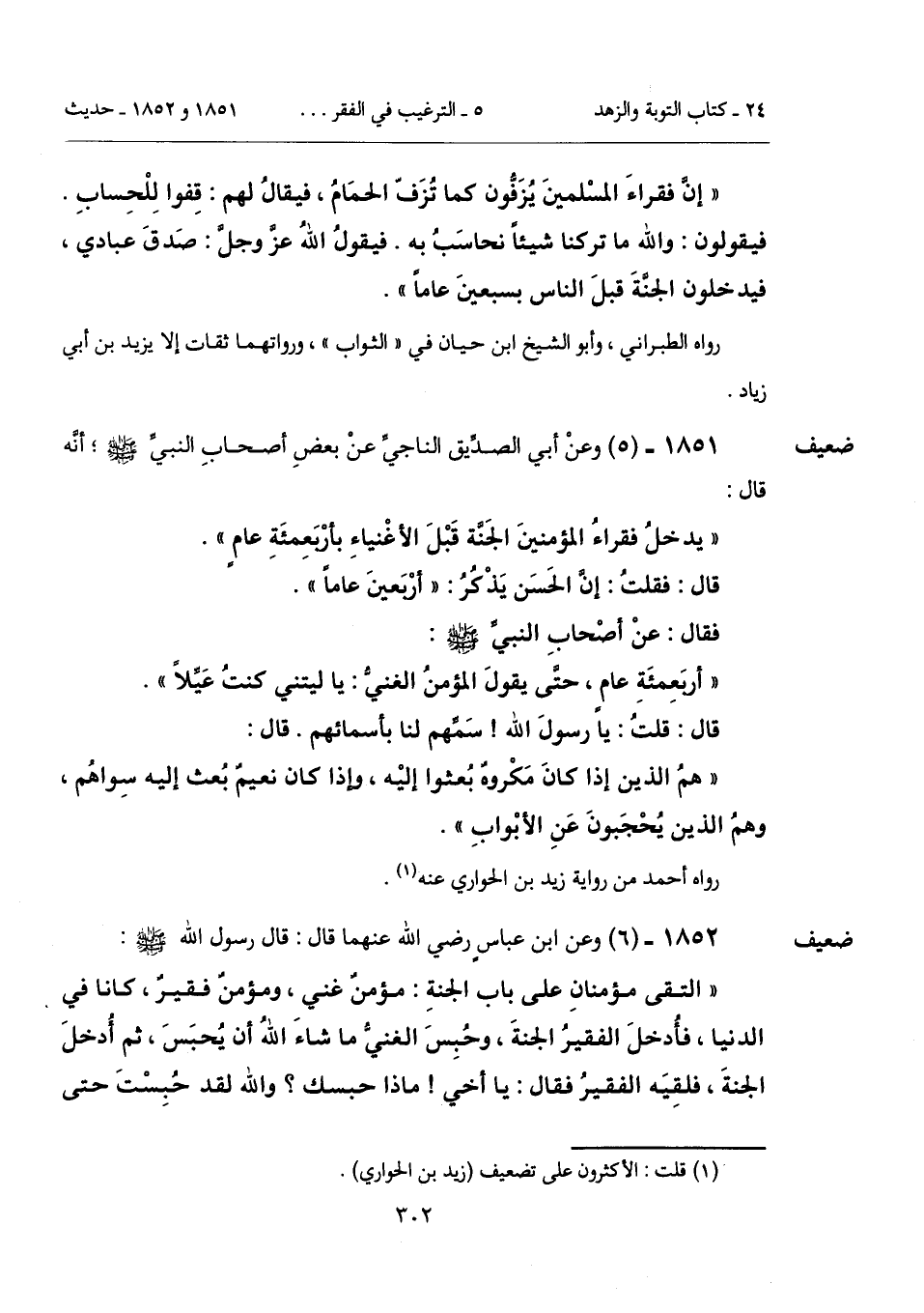 "يدخلُ فقراءُ المؤمنينَ الجَنَّة قَبْلَ الأغْنياءِ بأرْبَعِمئَةِ عامٍ".