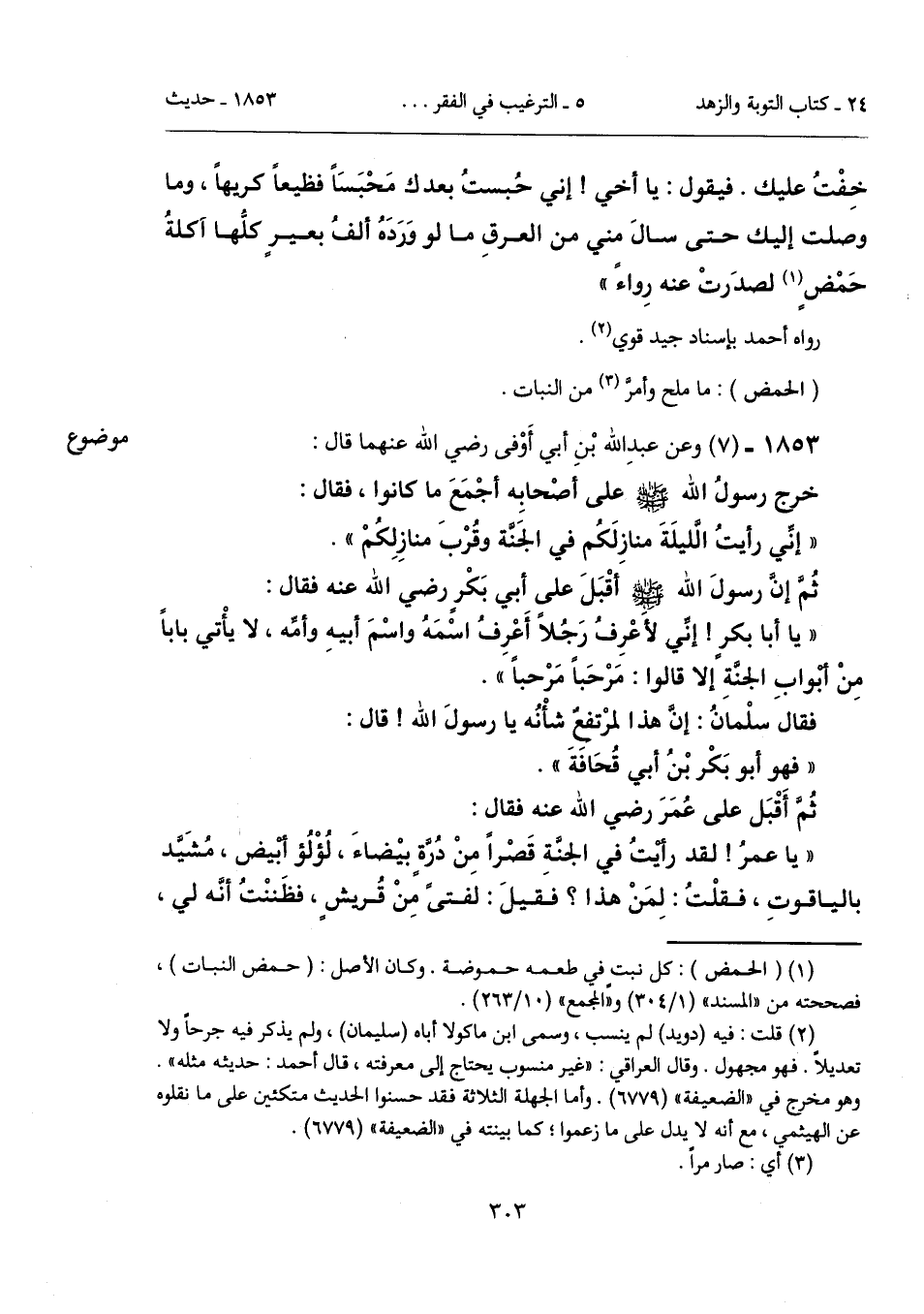 (¬1) (الحمض): كل نبتٍ في طعمه حموضة. وكان الأصل: (حمض النبات)، فصححته من "المسند" (1/ 304) و"المجمع" (10/ 263).