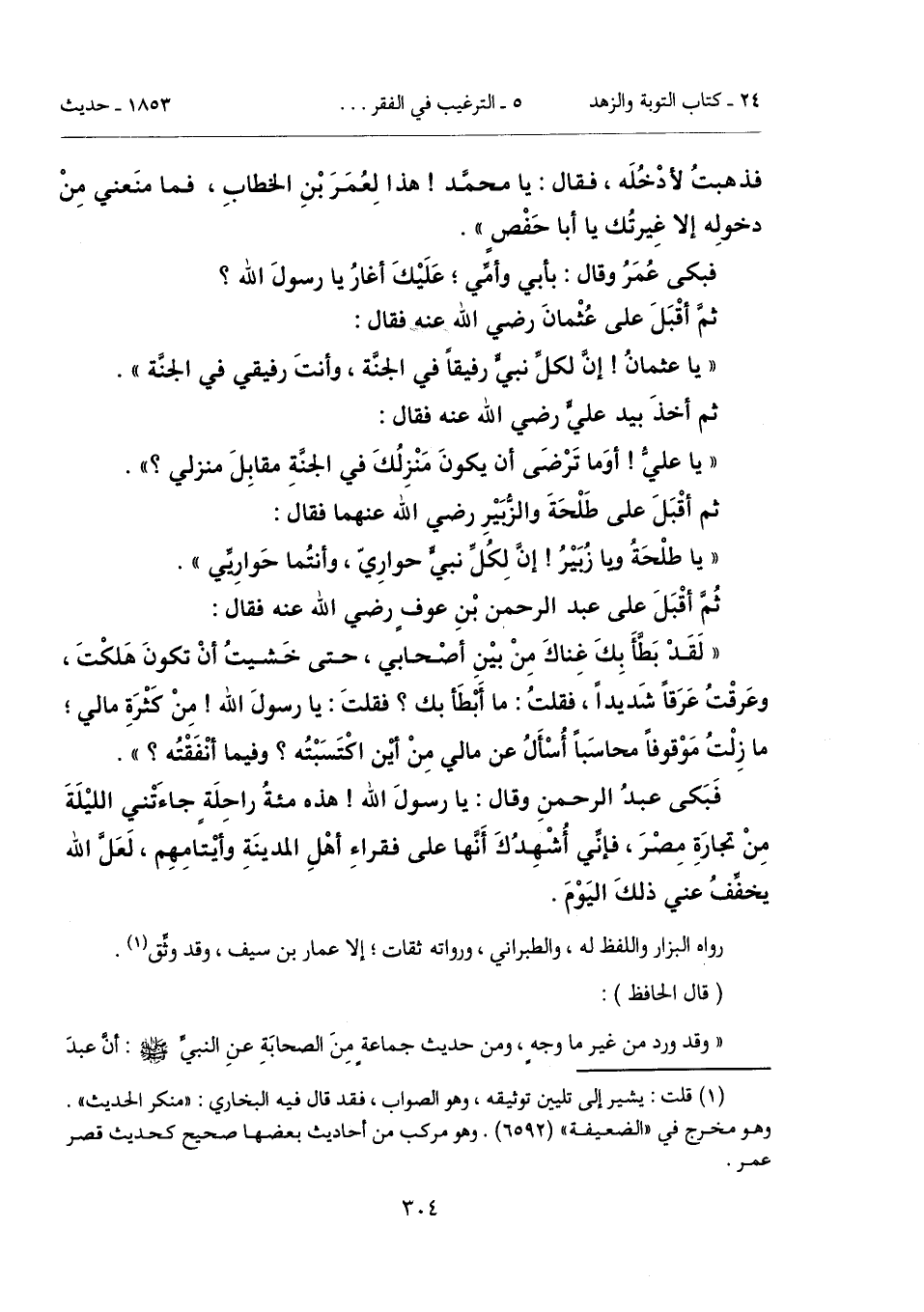 "لَقَدْ بَطَّأَ بِكَ غِناكَ مِنْ بيْنِ أصْحابي، حتى خَشيتُ أنْ تكونَ هَلكْتَ، وعَرقْتُ عَرَقاً شَديداً، فقلتُ: ما أبْطَأ بك؟ فقلتَ: يا رسولَ الله! مِنْ كَثْرَةِ مالي؛ ما زِلْتُ مَوْقوفاً محاسَباً أُسْأَلُ عن مالي مِنْ أيْن اكْتَسَبْتُه؟ وفيما أنْفَقْتُه؟ ".