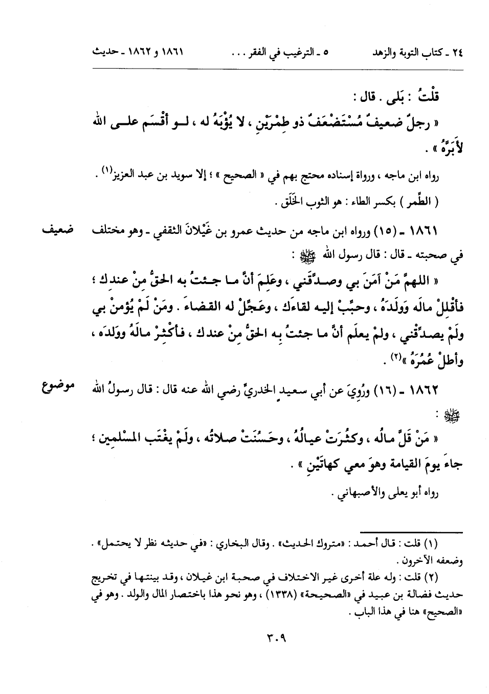 (¬2) قلت: وله علة أخرى غير الاختلاف في صحبة ابن غيلان، وقد بينتها في تخريج حديث فضالة بن عبيد في "الصحيحة" (1338)، وهو نحو هذا باختصار المال والولد. وهو في "الصحيح" هنا في هذا الباب.