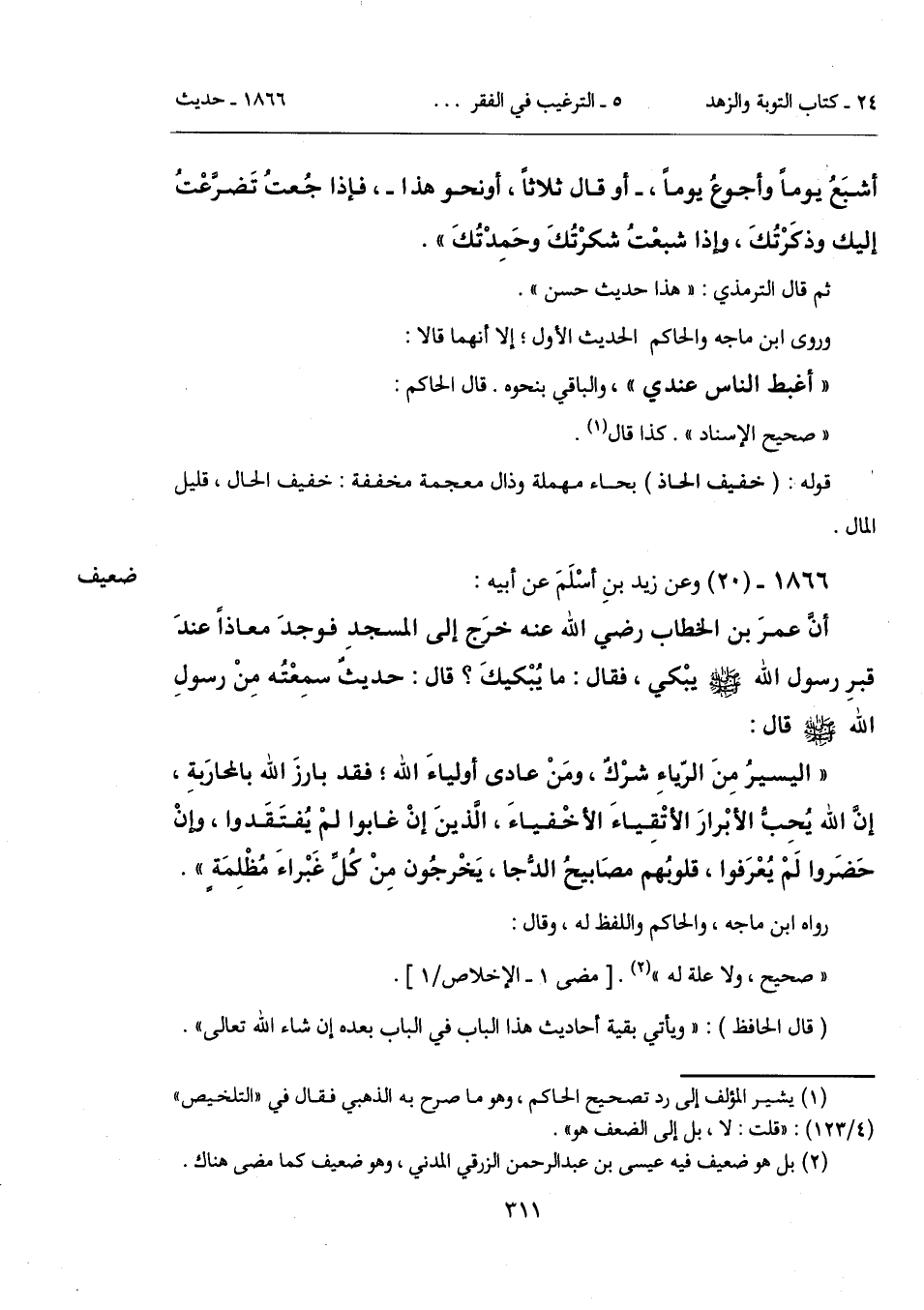 (¬2) بل هو ضعيف فيه عيسى بن عبد الرحمن الزرقي المدني، وهو ضعيف كما مضى هناك.