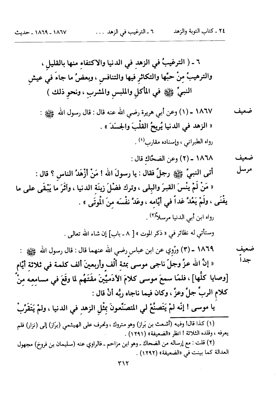 6 - (الترغيبُ في الزهدِ في الدنيا والاكتفاءِ منها بالقليلِ، والترهيبُ مِنْ حبِّها والتكاثرِ فيها والتنافسِ، وبعضُ ما جاءَ في عيشِ النبيِّ - صلى الله عليه وسلم - في المأكلِ والملبسِ والمشربِ، ونحوِ ذلك).