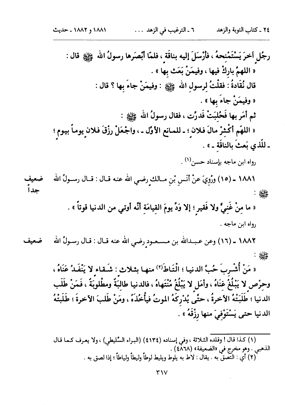 "اللهّم أكْثِرْ مالَ فلانٍ؛ -للمانع الأوَّل-، واجْعَلْ رزْقَ فلانٍ يوماً بيومٍ؛ -للّذي بَعثَ بالناقَةِ-".
