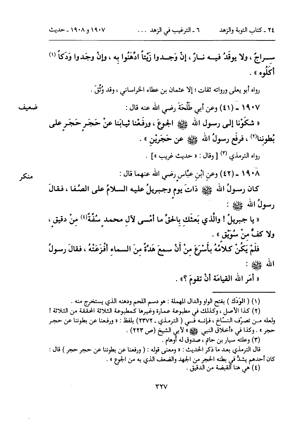 (¬2) كذا الأصل، وكذلك في مطبوعة عمارة وغيرها كمطبوعة الثلاثة المحققة من الثلاثة! ولعله من تصرّف النسّاخ، فإنه في (الترمذي - 2372) بلفظ: "ورفعنا عن بطوننا عن حجر حجر". وكذا في "أخلاق النبي - صلى الله عليه وسلم -" لأبي الشيخ (ص 223).