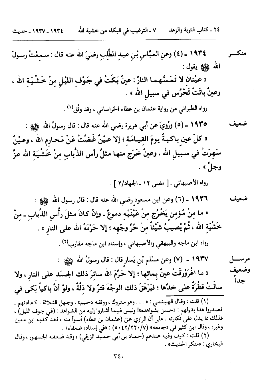 "ما مِنْ مُؤمِنٍ يَخْرُج مِنْ عَيْنَيْهِ دموعٌ -وإنْ كانَ مثلَ رأْسِ الذُبابِ- مِنْ خَشْيَةِ الله، ثُمَّ يُصيبُ شَيْئاً مِنْ حُرِّ وجْهِه؛ إلا حَرَّمَهُ الله على النارِ".