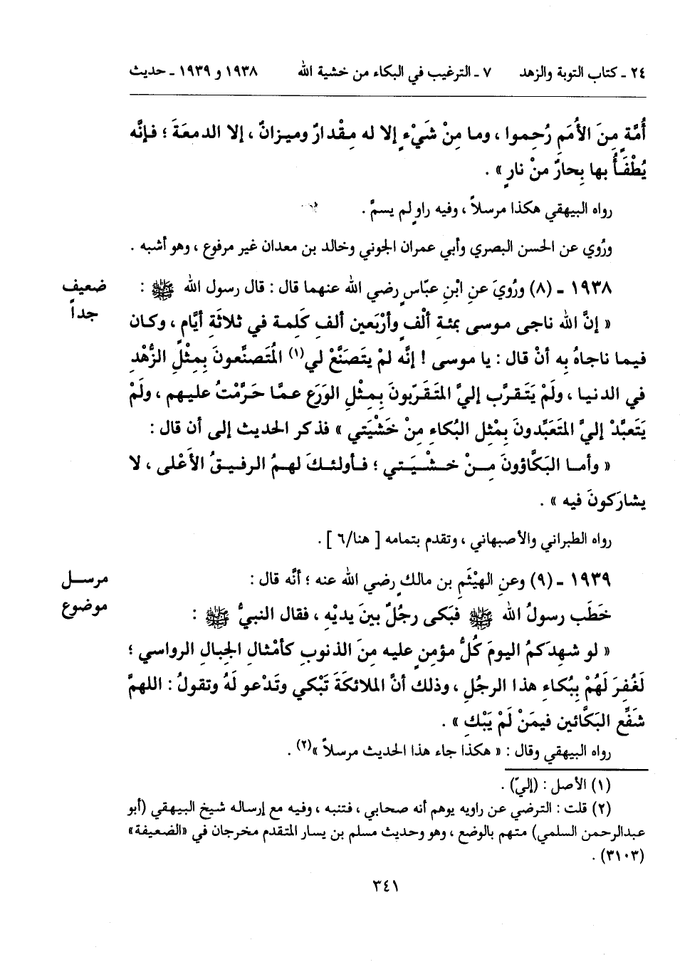 "لو شهِدَكمُ اليومَ كُلُّ مؤمِنٍ عليه مِنَ الذنوبِ كأمْثالِ الجِبالِ الرواسي؛ لَغُفرَ لَهُمْ بِبُكاءِ هذا الرجُلِ، وذلك أنَّ الملائكَةَ تَبْكي وتَدْعو لَهُ وتقولُ: اللهمَّ شَفِّعَ البَكَّائين فيمَنْ لَمْ يَبْك".