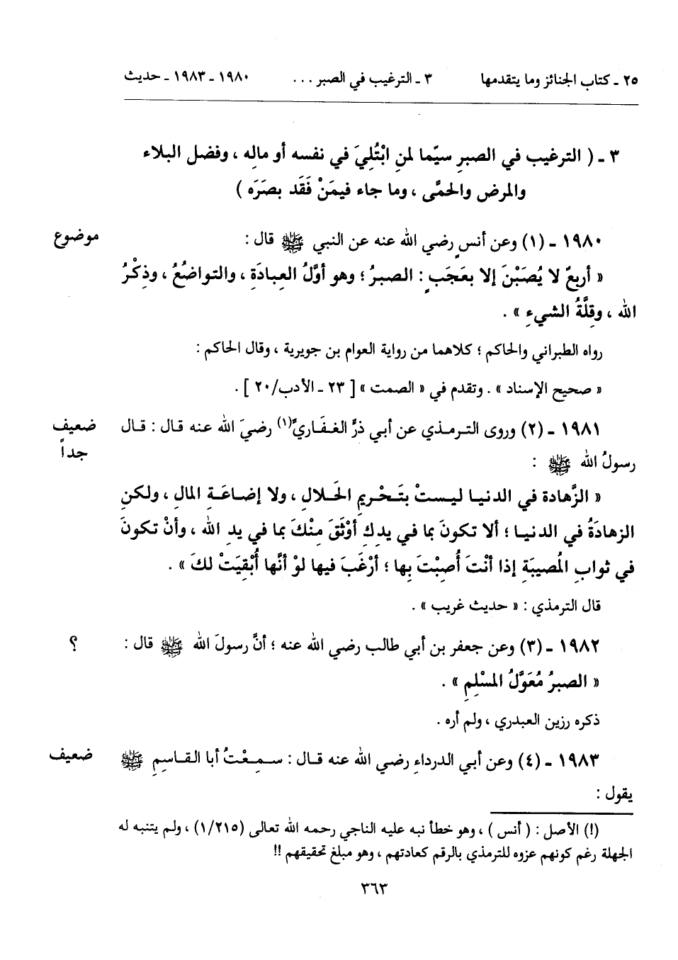 3 - (الترغيب في الصبرِ سيّما لمنِ ابْتُلِيَ في نفسه أو مالِه، وفضل النبلاء والمرض والحمَّى، وما جاء فيمَنْ فَقَد بصَرَه).
