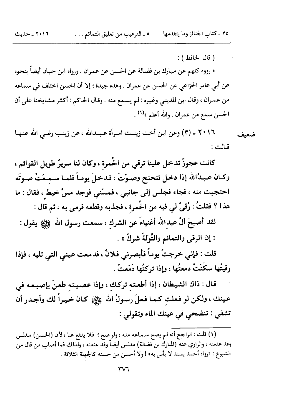 2016 - (3) [ضعيف] وعن ابن أخت زينت امرأة عبد الله، عن زينب رضي الله عنها قالت: