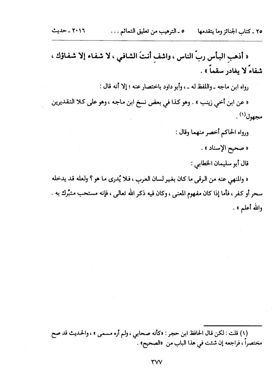 "أذهبِ البأس ربٌ الناس، واشفِ أنتَ الشافي، لا شفاء إلا شفاؤك، شفاءٌ لا يغادر سقماً".