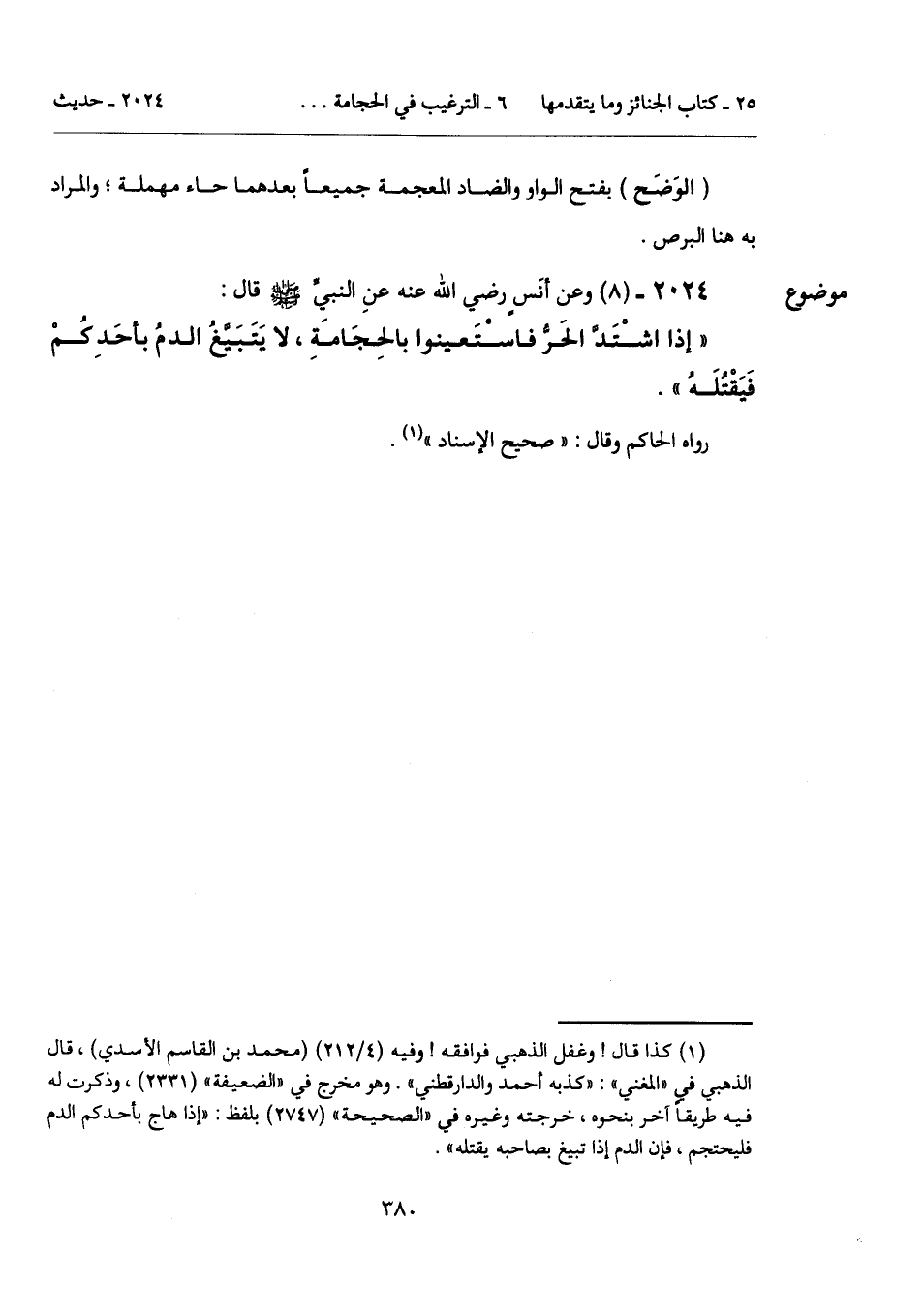 "إذا اشْتَدَّ الحَرُّ فاسْتَعينوا بالحِجَامَةِ، لا يَتَبَيَّغُ الدمُ بأحَدِكُمْ فَيَقْتُلَهُ".