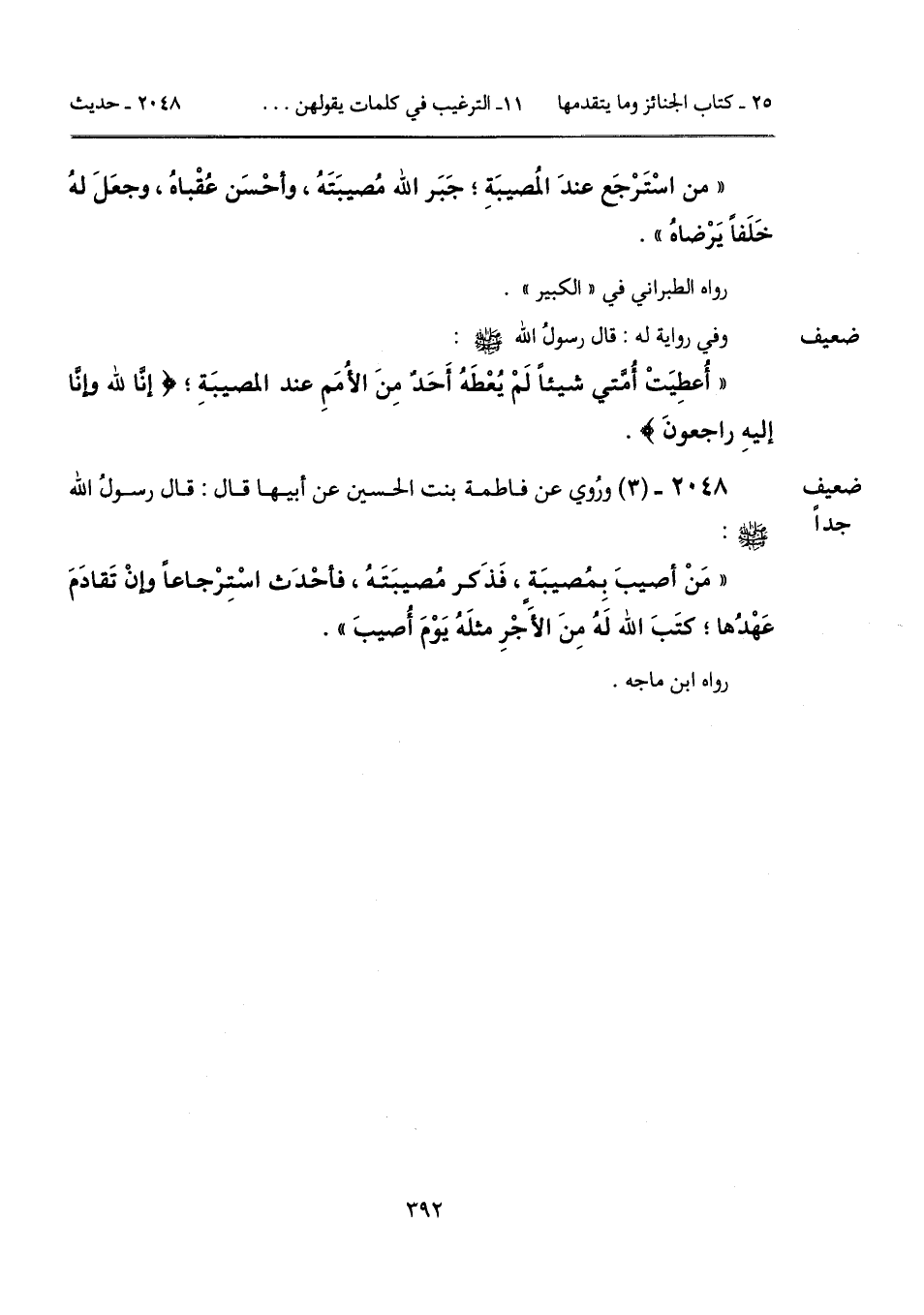 "أُعطِيَتْ أُمَّتي شيئاً لَمْ يُعْطَهُ أَحَدٌ مِنَ الأُمَمِ عند المصيبَةِ؛ {إِنَّا لِلَّهِ وَإِنَّا إِلَيْهِ رَاجِعُونَ}.