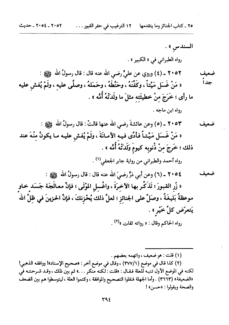 "مَنْ غسَل مَيِّتاً، وكَفَّنَهُ، وحَنَّطَهُ، وحَمَلهُ، وصلَّى عليهِ، ولَمْ يفشِ عليه ما رأى؛ خَرَجَ مِنْ خطيئَتِهِ مثلَ ما ولَدَتْهُ أُمُّه".