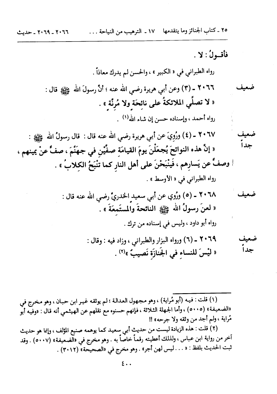 "إنَّ هذه النوائحِ يُجعَلْنَ يومَ القيامَةِ صفَّيْنِ في جهَنَّمَ، صفٌّ عنْ يمينهم، وصفٌّ عن يَسارِهم، فينْبَحْنَ على أهل النارِ كما تنْبَحُ الكِلابُ".
