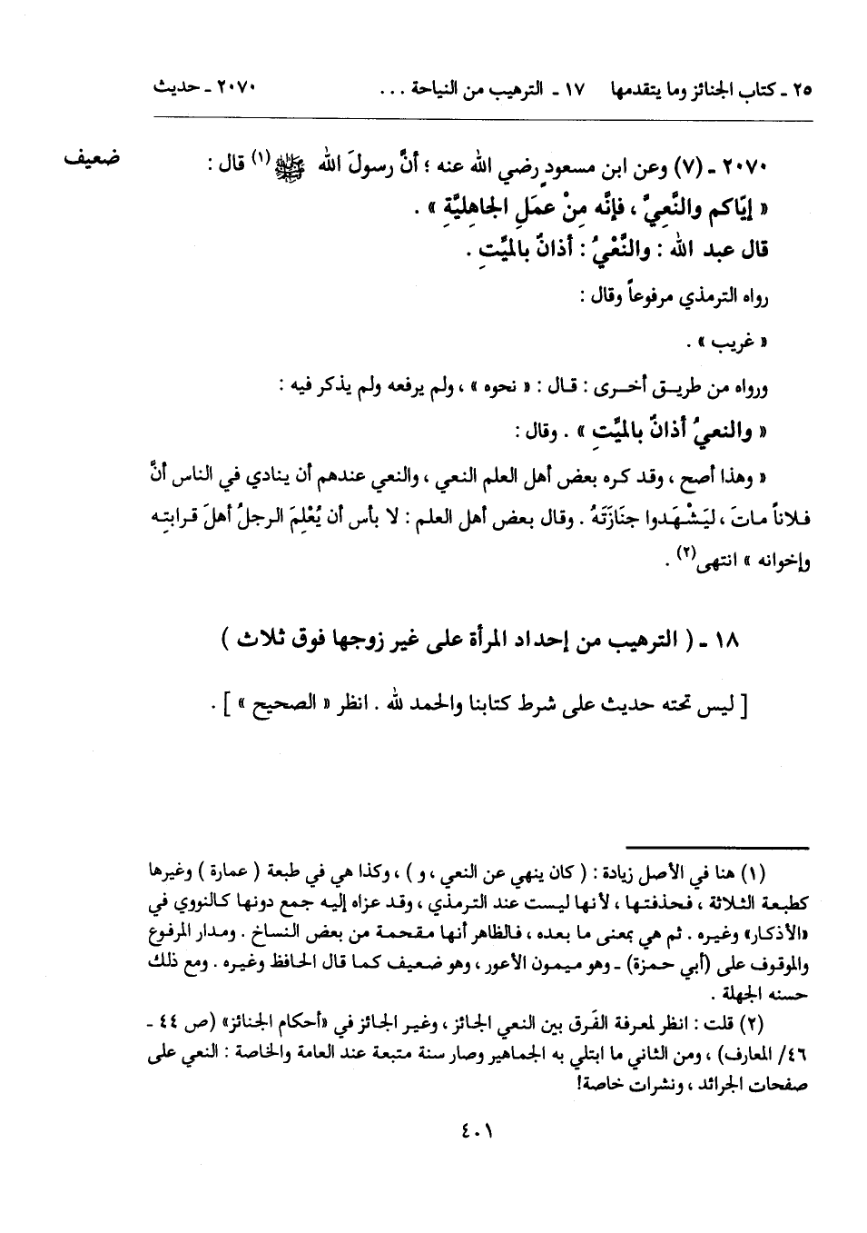 (¬2) قلت: انظر لمعرفة الفَرق بين النعي الجائز، وغير الجائز في "أحكام الجنائز" (ص 44 - 46/ المعارف)، ومن الثاني ما ابتلي به الجماهير وصار سنة متبعة عند العامة والخاصة: النعي على صفحات الجرائد، ونشرات خاصة!